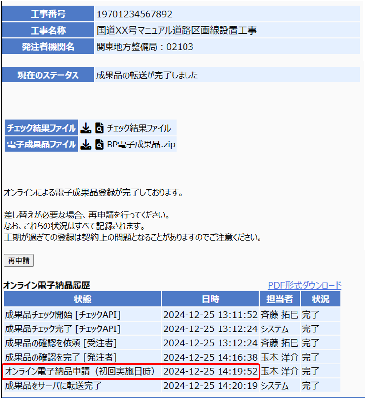 登録データの差し替え作業を行うことにより、オンライン電子納品履歴の情報が更新されますが、「オンライン電子納品申請(初回実施時)」の日時のみ、当初の日時が表示されます。