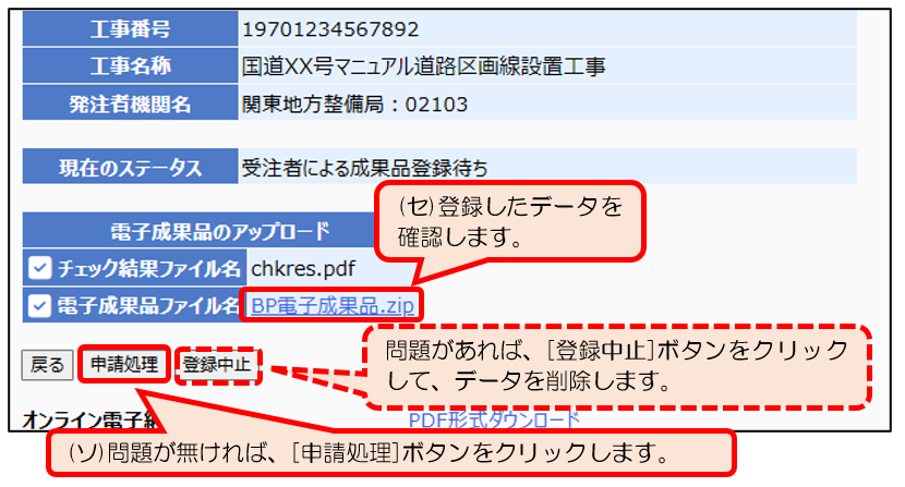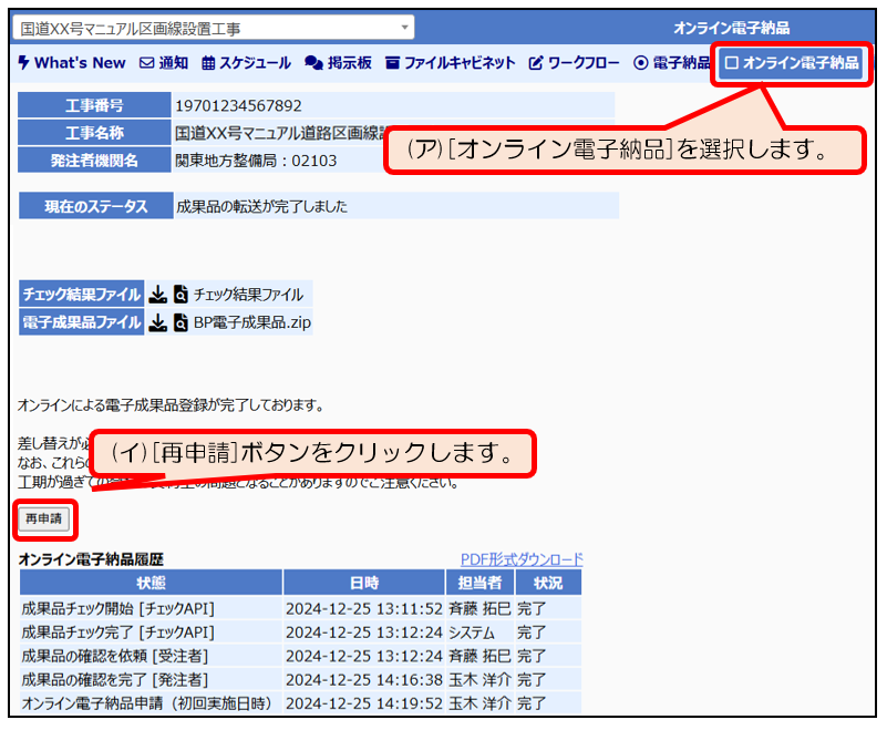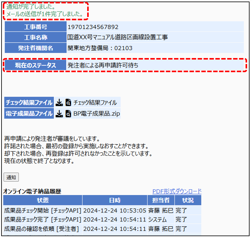 (ケ)通知完了後、発注者にて再申請を許諾いただくとオンライン電子納品の画面が下図の状態になります。