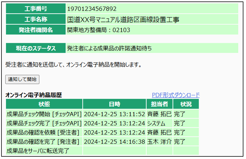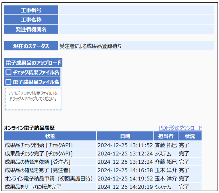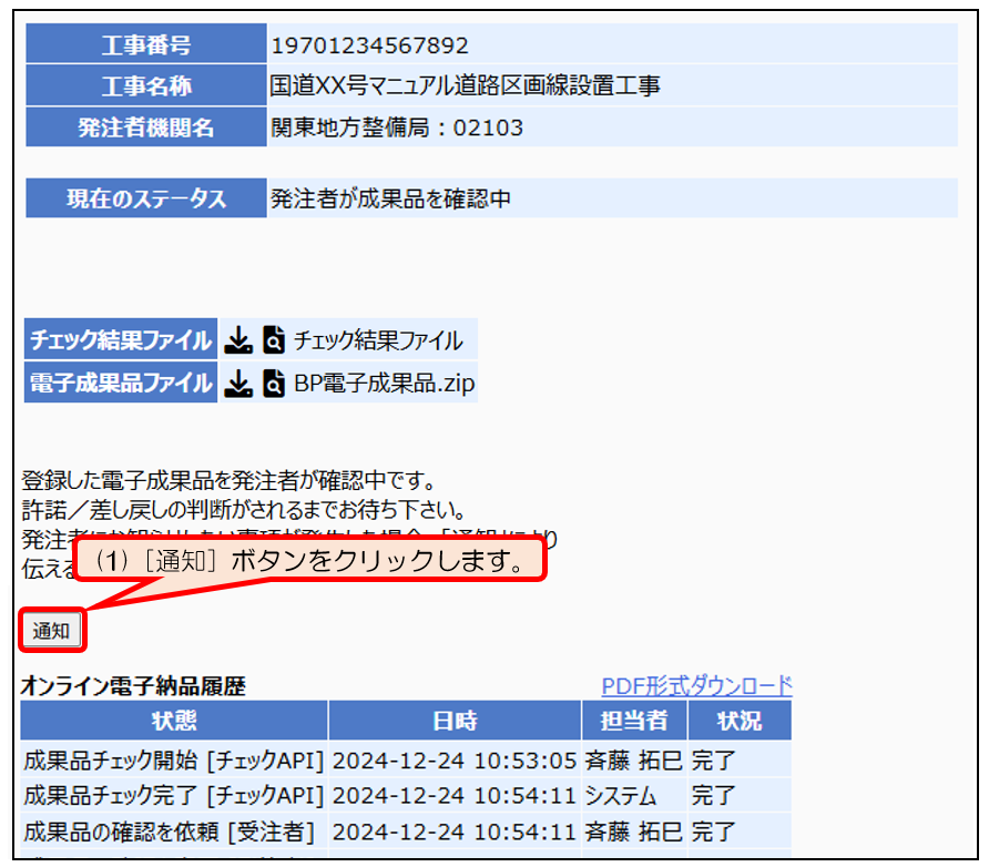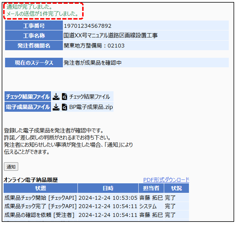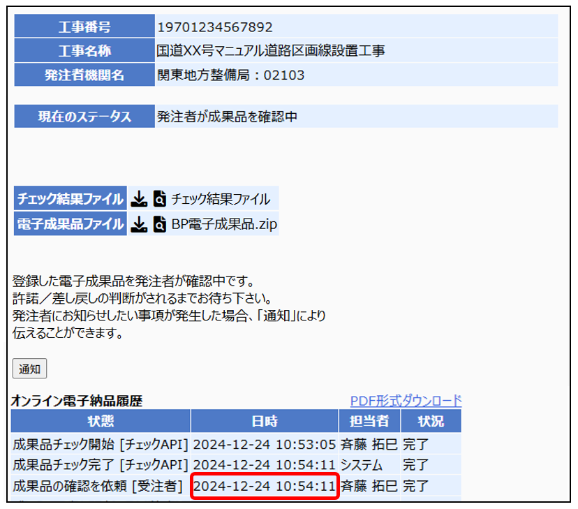 (ヌ)再ログイン後、オンライン電子納品履歴の「成果品の確認を依頼[受注者]」の日時が更新されておりましたら、チェックAPIのチェックにおいてエラーが検出されず、発注者へ確認依頼の通知が送信されております。