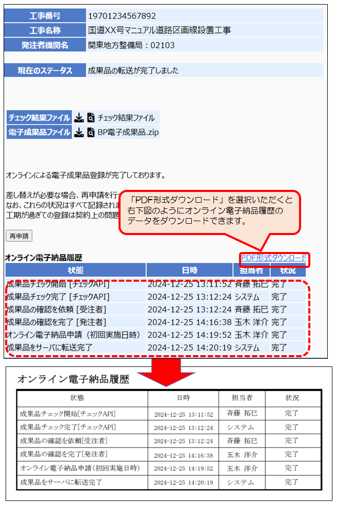 オンライン電子納品履歴の一覧の右上にある「PDF形式ダウンロード」をクリックすると、PDF形式でオンライン電子納品の履歴をダウンロードすることができます。