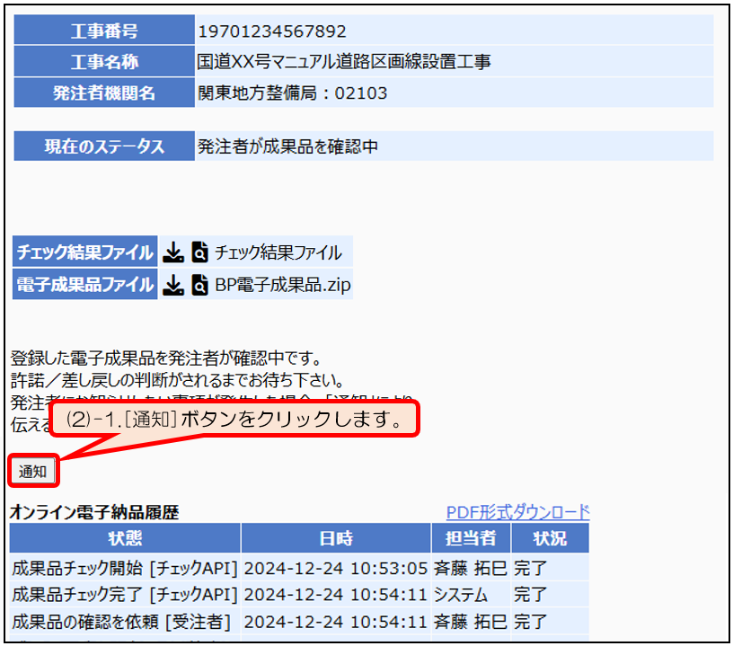 (2)-1.オンライン電子納品画面の中央に表示されている[通知]ボタンをクリックします。
