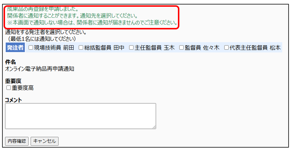 (ウ)「成果品の再登録を申請しました。」と表示されましたら成功です。成果品の再登録依頼を確実にお伝えするために、通知の手配を行います。