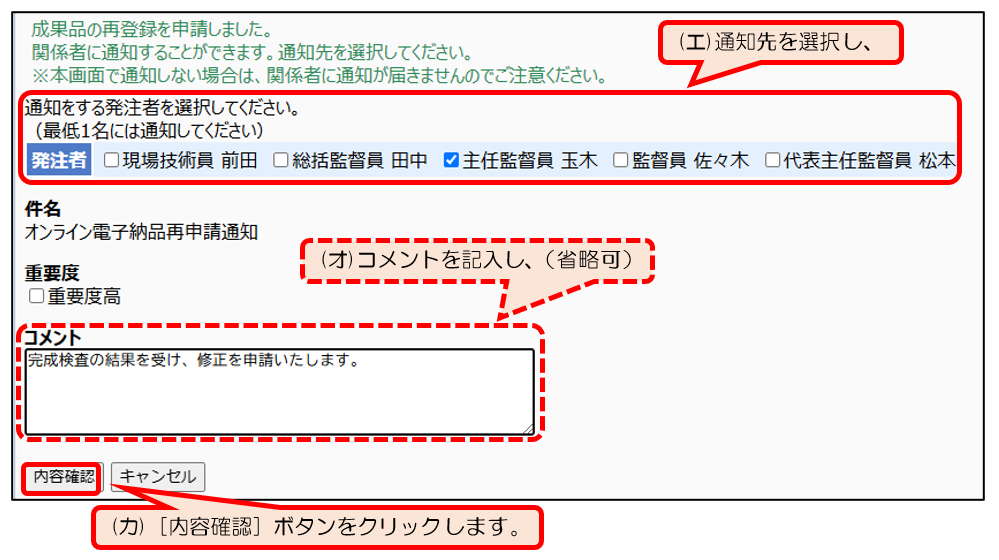 (エ)[申請処理]後の通知先の欄で発注者メンバーから通知先を選択します。通常、電子成果品の登録に対する承認は主任監督員が行いますので、主任監督員を選択します。