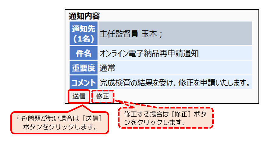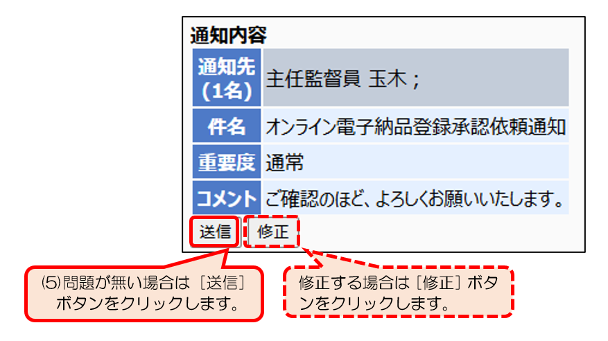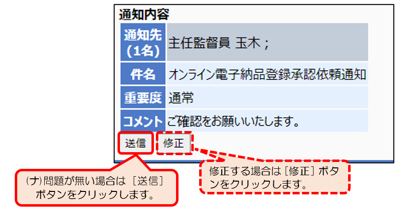 (ナ)確認画面が表示されますので、内容を確認し、問題が無い場合は[送信]ボタンをクリックします。修正する場合は[修正]ボタンをクリックします。