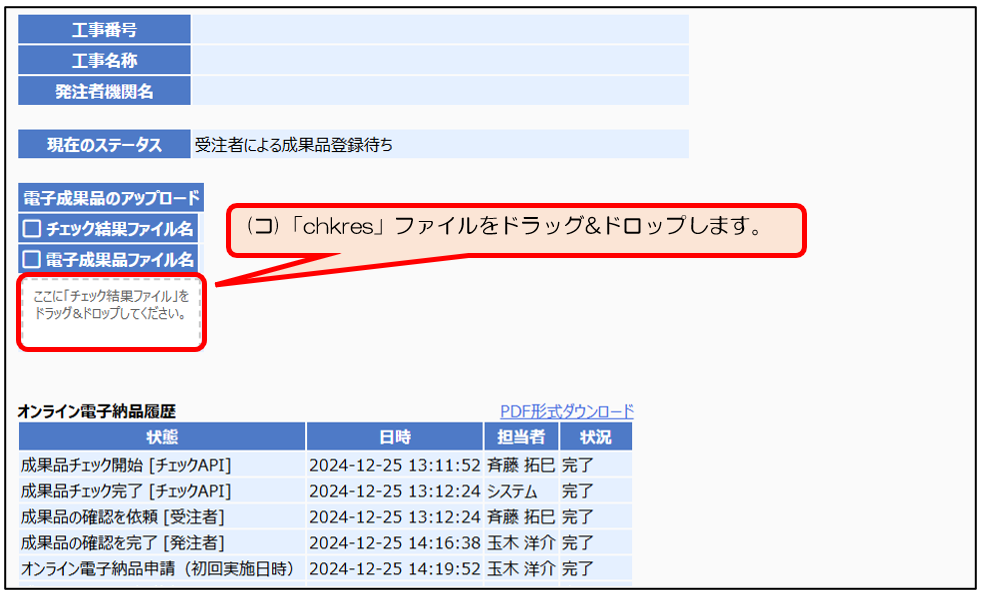 (コ)差し替えデータの「chkres」ファイルを<電子成果品のアップロード>下部の『ここに「チェック結果ファイル」をドラッグ&ドロップしてください。』と記載された破線枠内にドラッグ&ドロップします。