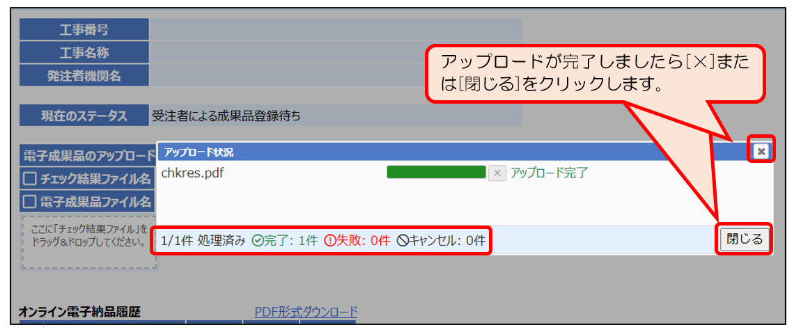 [OK]ボタンをクリック後、アップロードが開始され、アップロード状況が確認できます。アップロードがすべて完了しましたら、[×]ボタンもしくは[閉じる]ボタンをクリックします。