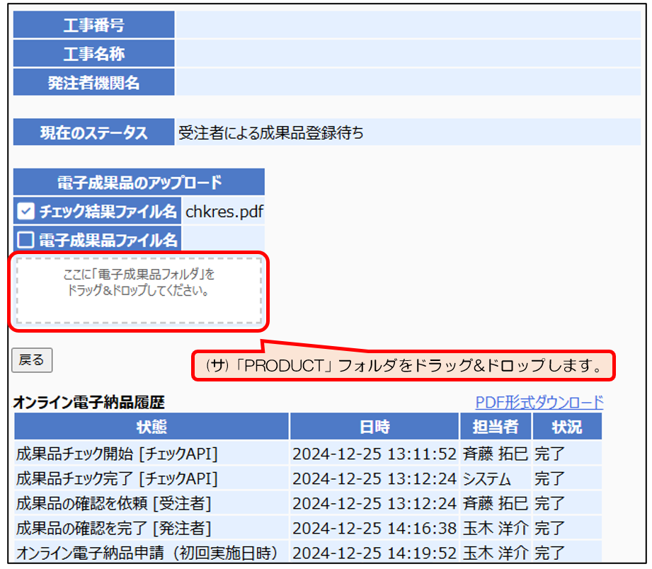 (サ)差し替えデータの「PRODUCT」フォルダを<電子成果品のアップロード>下部の『ここに「電子成果品フォルダ」をドラッグ&ドロップしてください。』と記載された破線枠内にドラッグ&ドロップします。