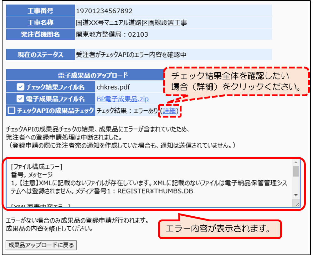 エラー内容を確認いただきましたら、成果品データ修正のため、[成果品アップロードに戻る]をクリックします。