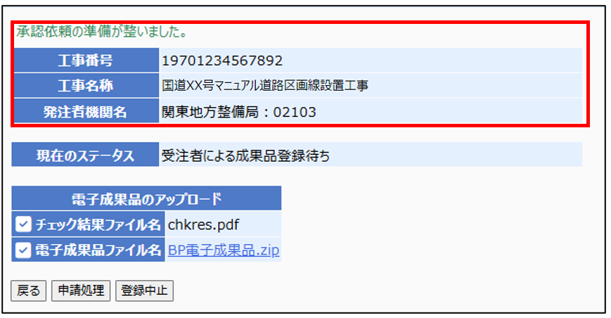 (ス)「承認依頼の準備が整いました。」と表示されましたら完了です。「工事番号」、「工事名称」、「発注機関名」も表示されます。