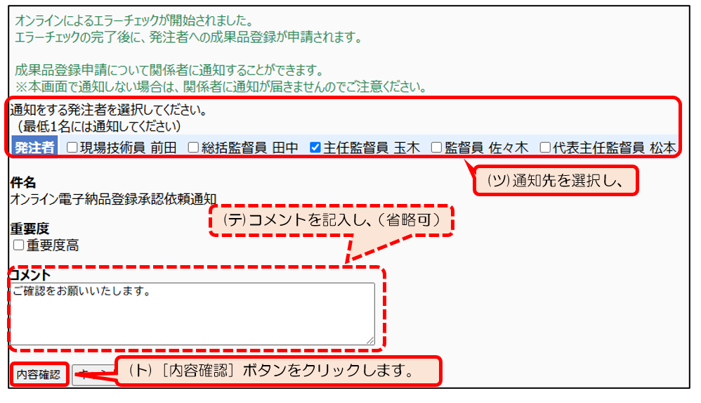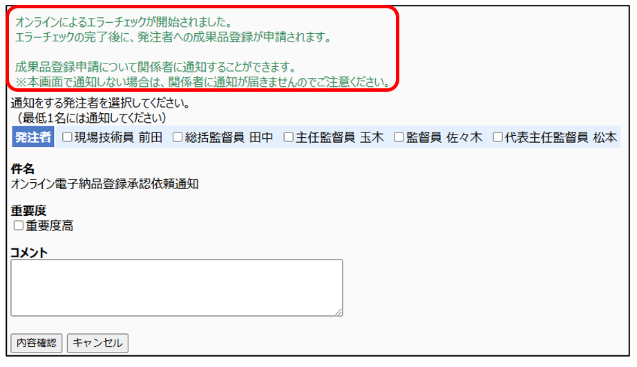 (チ)「オンラインによるエラーチェックが開始されました。」と表示されましたら成果品のエラーチェックが開始されます。成果品の確認依頼を確実にお伝えするために、エラーチェック完了後に送信される通知の手配を行います。