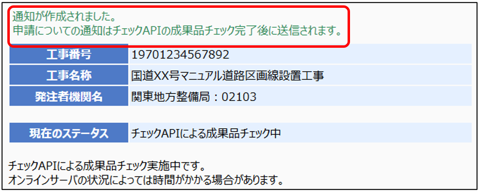 (ニ)「通知が作成されました。」と表示されましたら、チェックAPIによる電子成果品のチェックが開始されます。