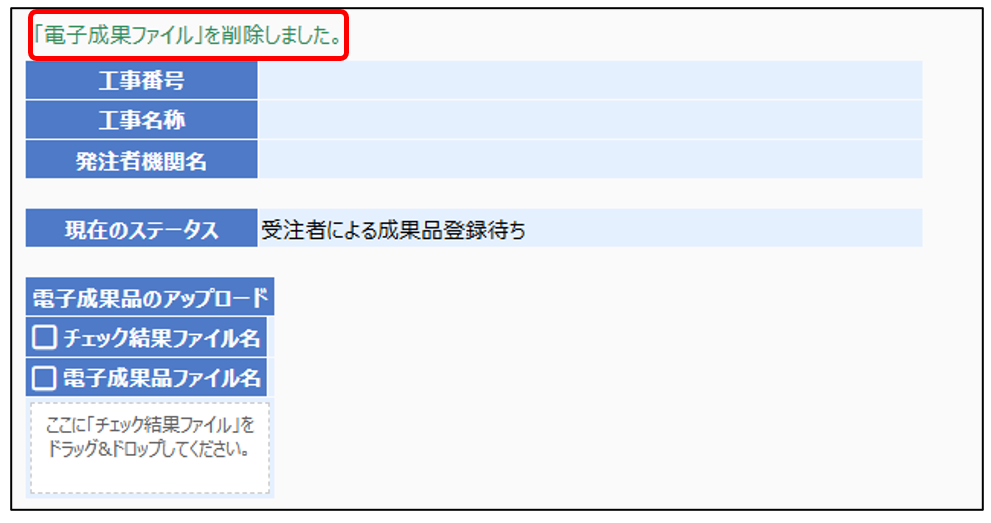 『「電子成果ファイル」を削除しました。』と表示されましたら、成果品データのエラー内容を「電納ヘルパー」などの電子成果品作成支援ソフトを用いて修正いただき、「別冊_オンライン電子納品操作マニュアル【工事編】」の「2-2.作成した電子成果品をチェックする」より手順をやり直してください。