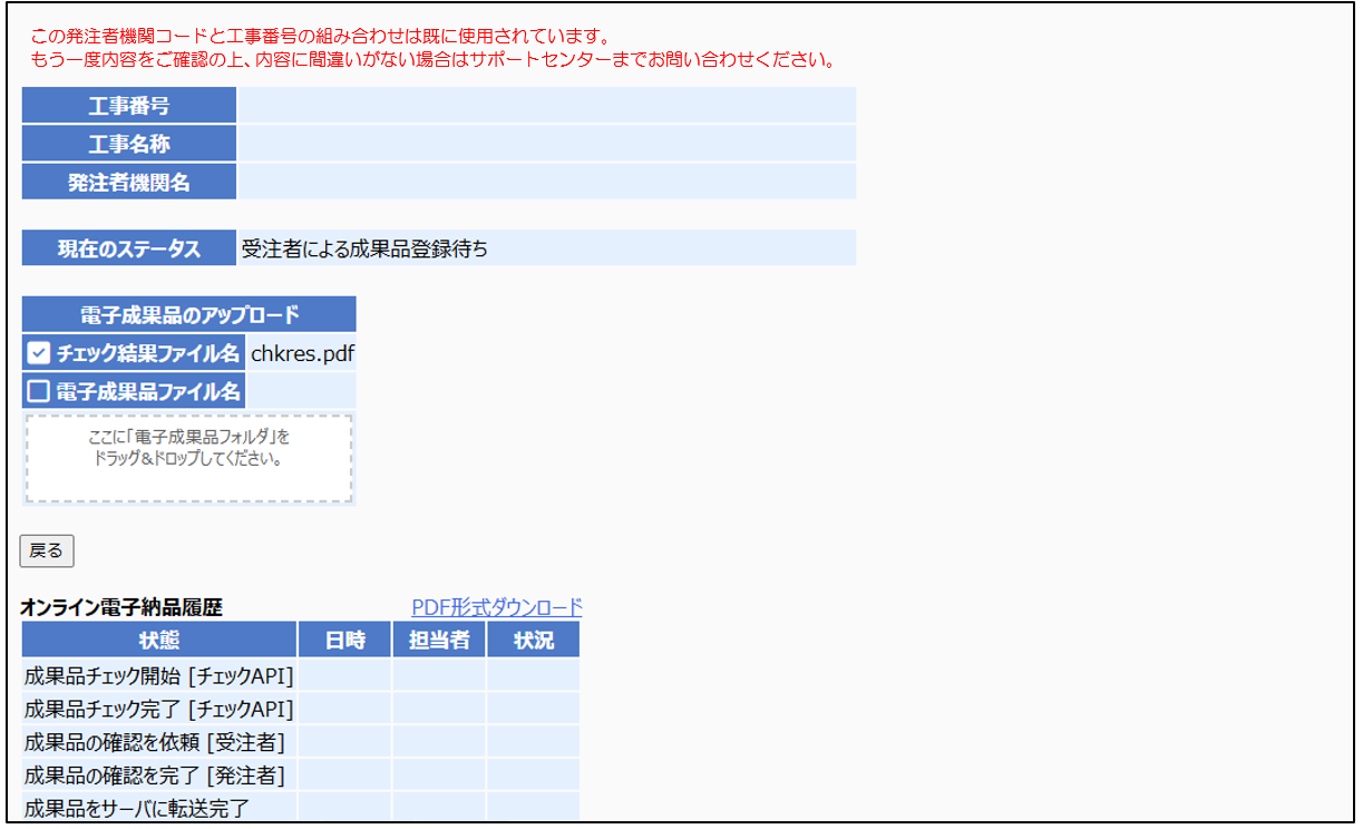 ご自身の工事の発注者機関名と工事番号が正しいかどうか再度ご確認ください。ご自身の工事の発注者機関名と工事番号が正しい場合は、カスタマーサポートセンターまでご連絡ください。