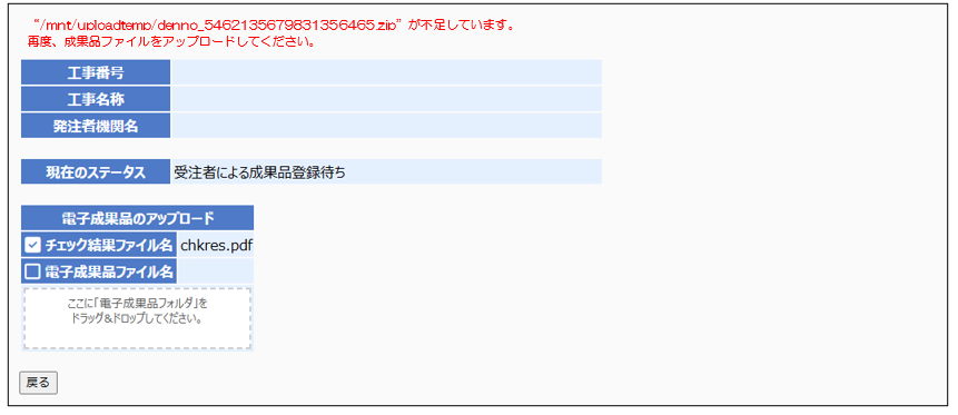 下図のように「“/mnt/uploadtemp/denno_…zip”が不足しています。」とエラーが出てしまい、成果品が登録できないことがあります。