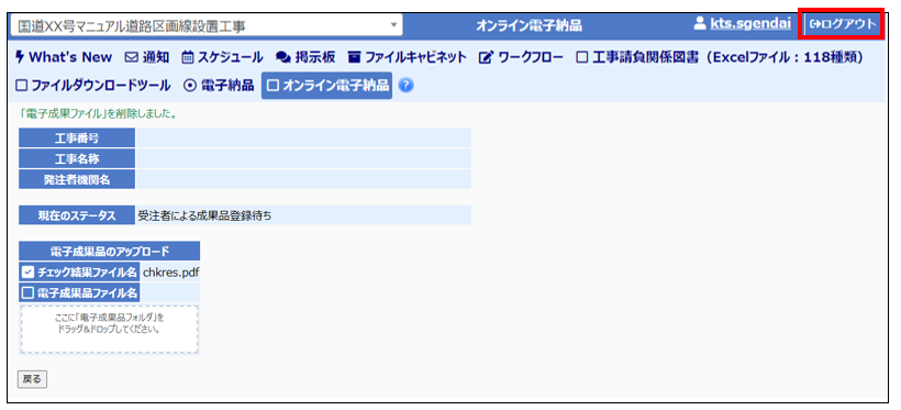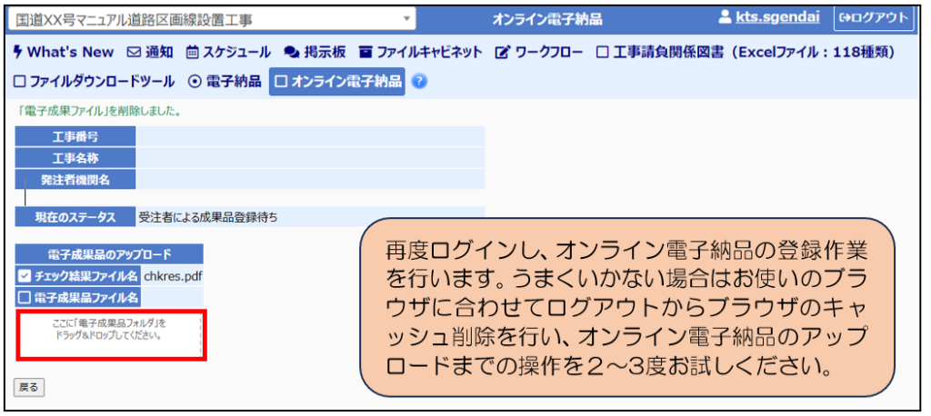 再度ログインし、オンライン電子納品の作業を行います。うまくいかない場合は、お使いのブラウザに合わせてログアウトからブラウザのキャッシュ削除を行い、オンライン電子納品のアップロードまでの操作を2~3度お試しください。