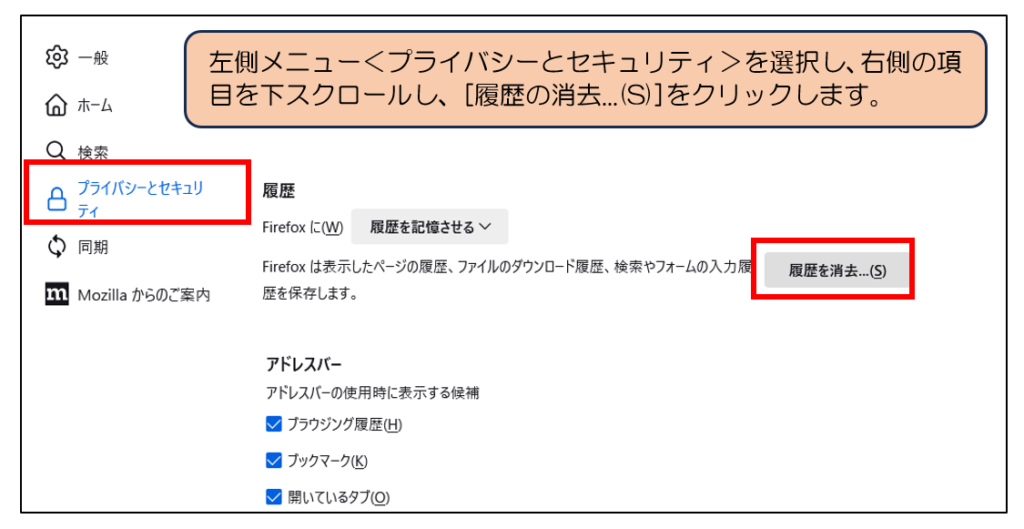 左側メニュー<プライバシーとセキュリティ>を選択し、右側の項目を下スクロールし、[履歴の消去…(S)]をクリックします。
