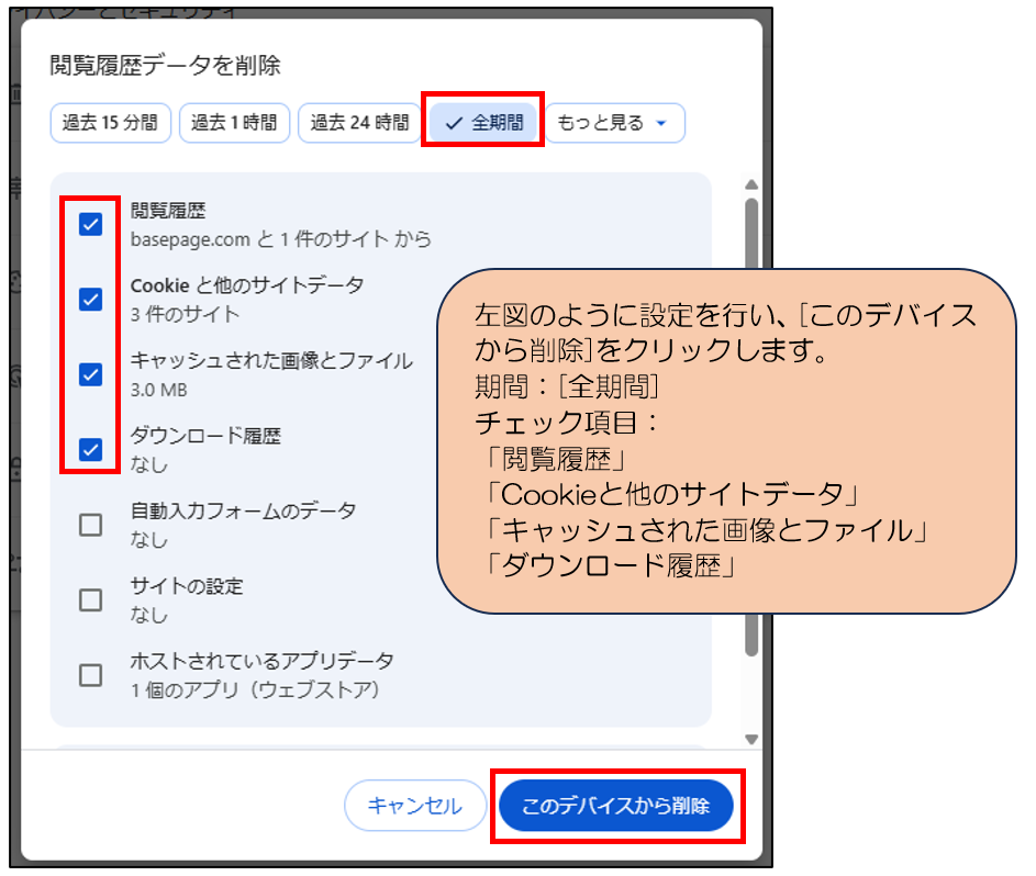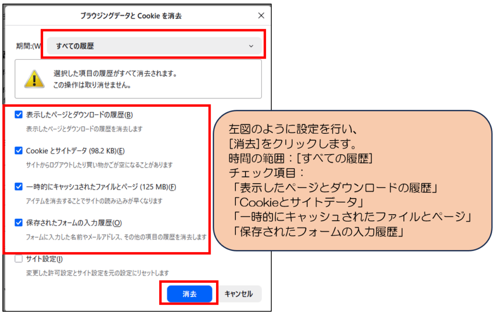以下のように設定を行い、[今すぐクリア]をクリックします。