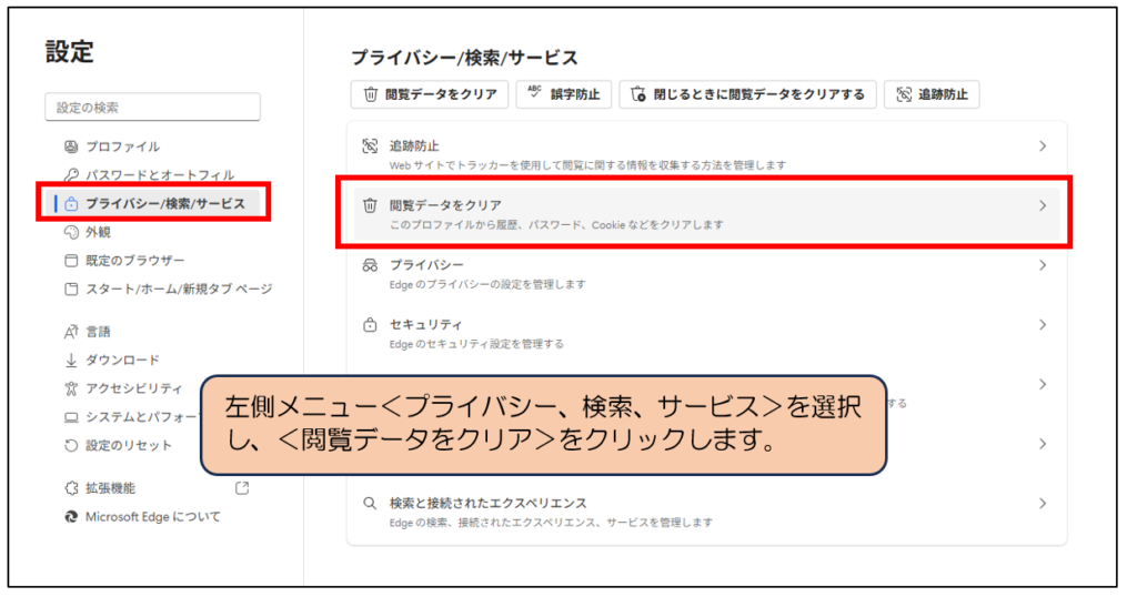 左側メニュー<プライバシー、検索、サービス>を選択し、<閲覧データをクリア>をクリックします。