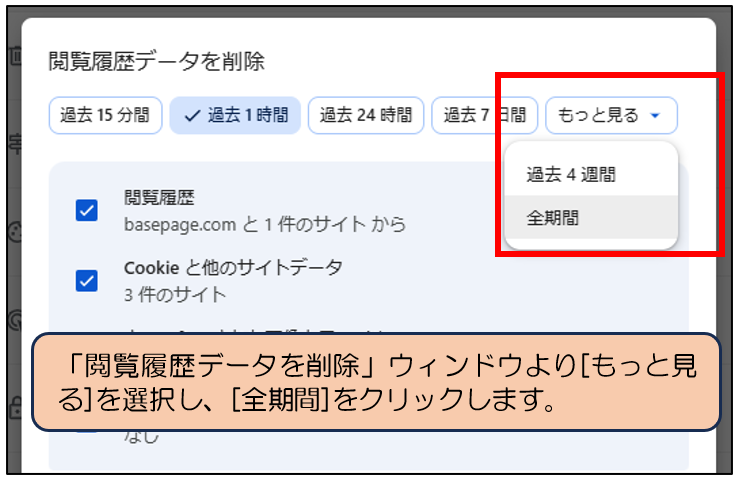 「閲覧履歴データを削除」ウィンドウより[もっと見る]を選択し、[全期間]をクリックします。