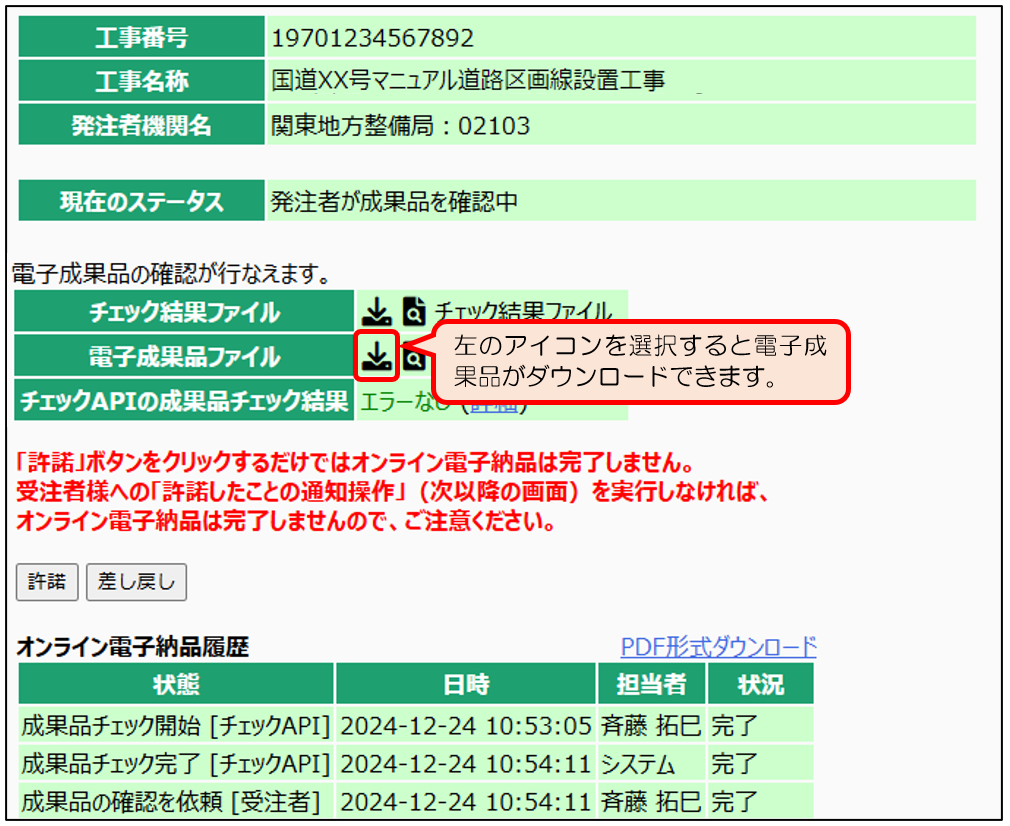 オンライン電子納品の成果品確認段階で、「電子成果品ファイル」の左のアイコンを選択すると電子成果品がダウンロードできます。