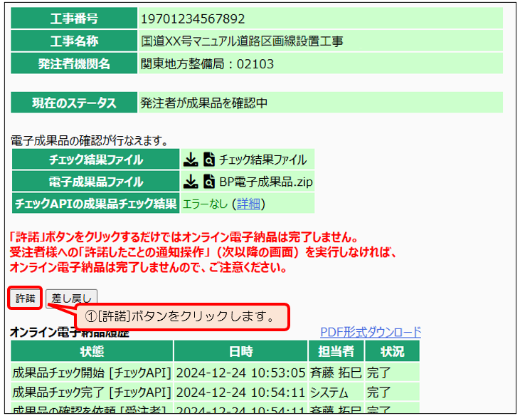 発注者側の成果品データに対する「許諾」操作は以下の2つの手順によって完了します。