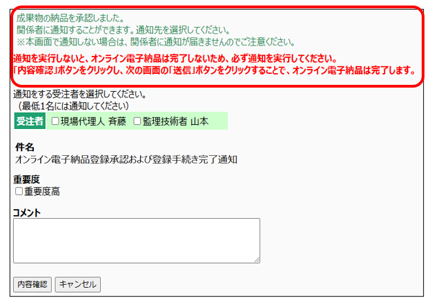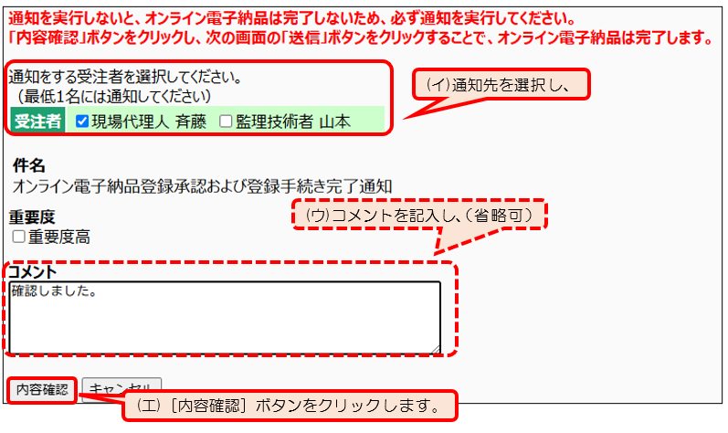 (イ)成果品の承認を確実に伝えるために、通知の手配を行います。