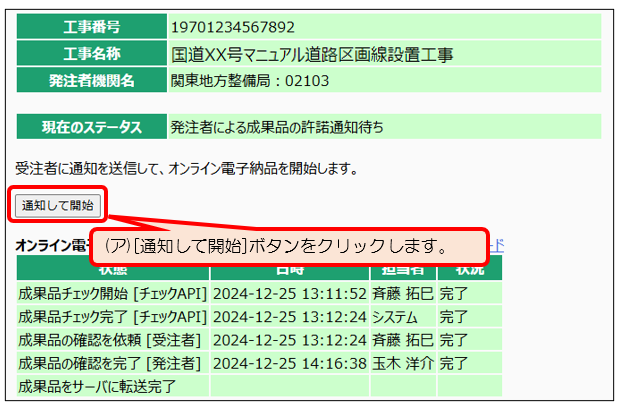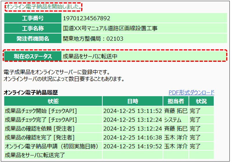 (ク)「オンライン電子納品が開始しました。」と表示されましたら、通知完了です。作業が完了した時点で現在のステータスが「成果品をサーバに転送中」に変わります。