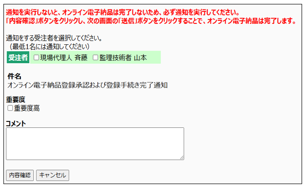 (テ)コメントとして伝える内容があれば、記入します。実際に送信されるメールに、オンライン電子納品のURL等必要な情報は自動的に挿入されますので、伝える内容が無ければ、省略していただいて問題ございません。
