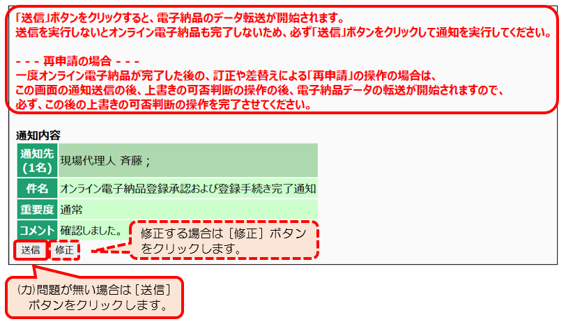 (カ)確認画面が表示されますので、赤字の注意書きを含め、内容を確認します。修正する場合は[修正]ボタンをクリックします。このままで問題ない場合は[送信]ボタンをクリックします。