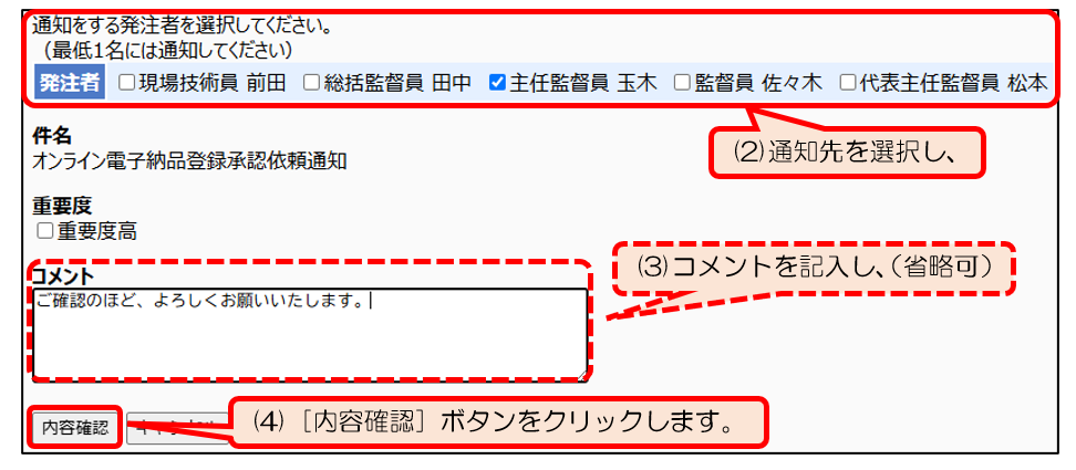 (イ)通知先の欄でメンバーから通知先を選択します。通常は、登録申請を行った受注者に行います。