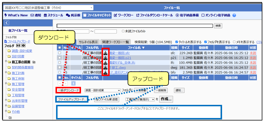 アップロードしたいファイルをパソコン上の格納先から、ドラッグ(左クリックした状態を継続)し、ファイルキャビネット内の破線枠上でドロップ(継続していた左クリックを解除)します。