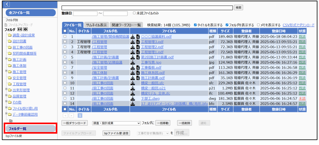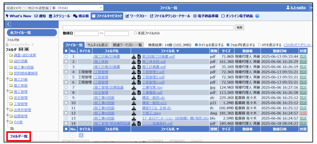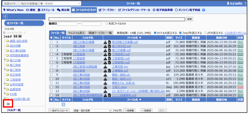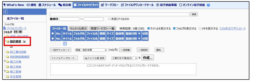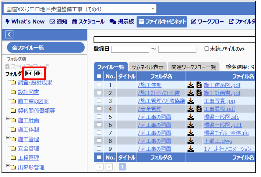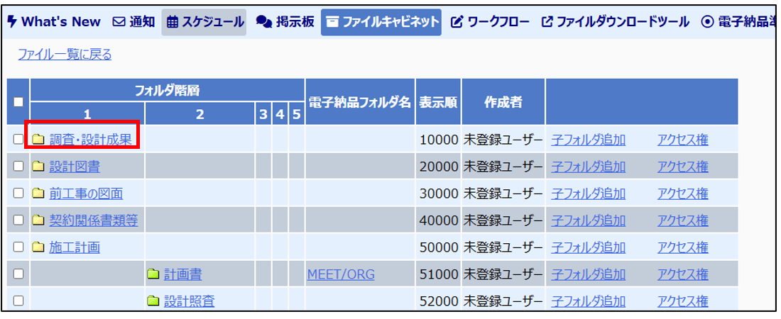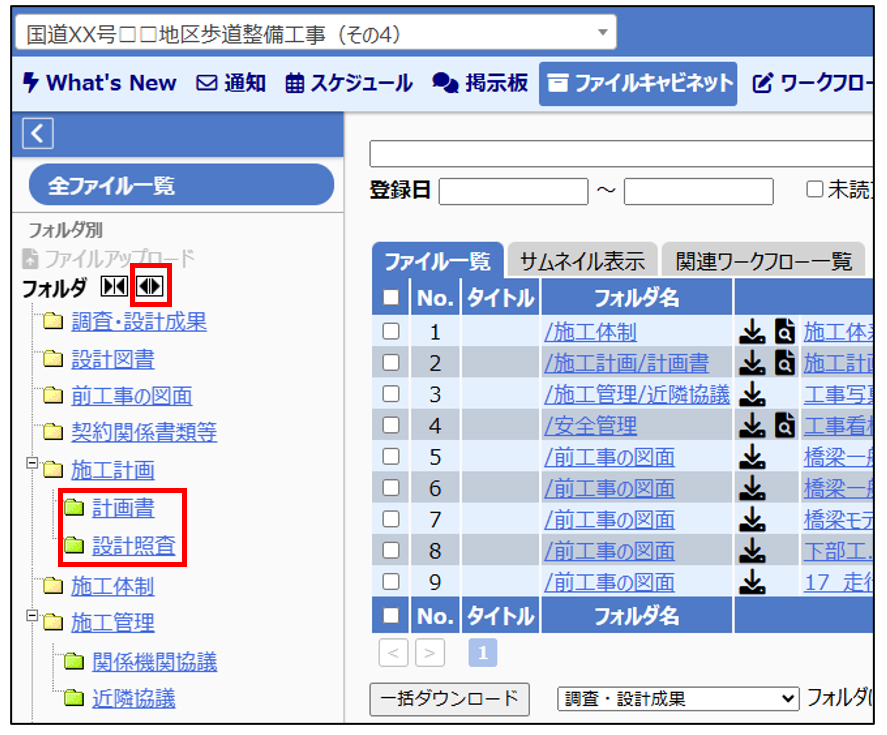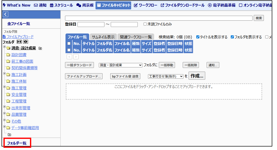 ファイルキャビネット左側メニューの<フォルダ一覧>をクリックします。