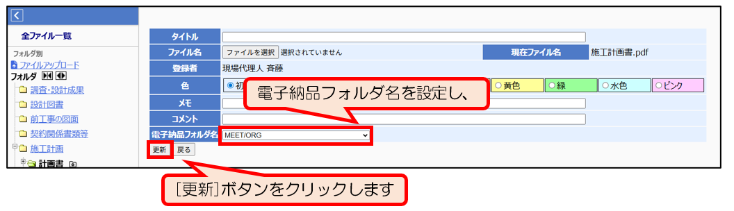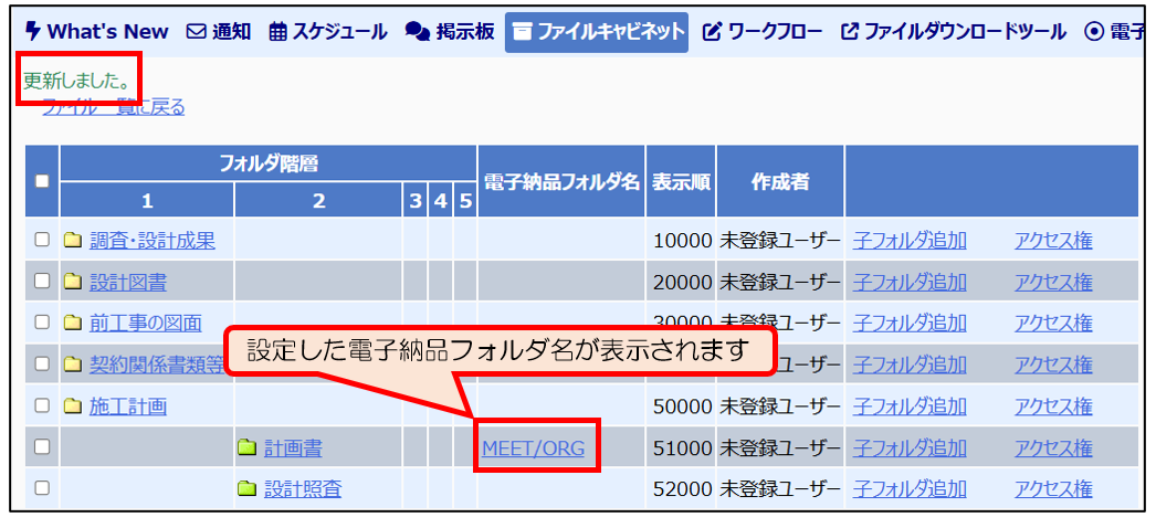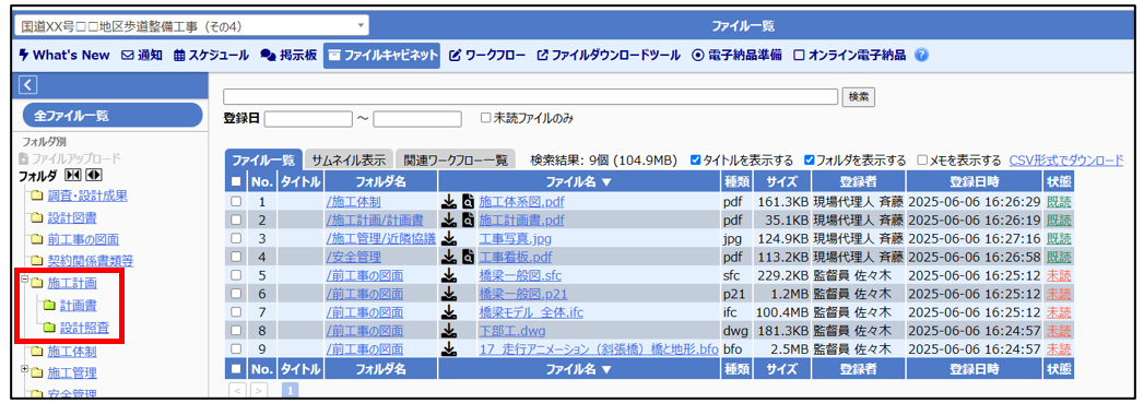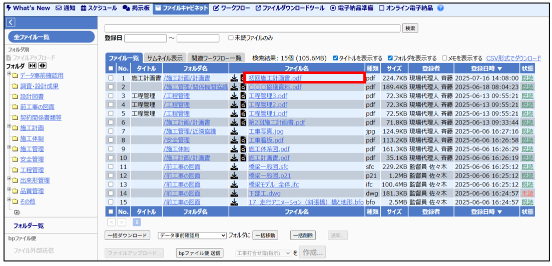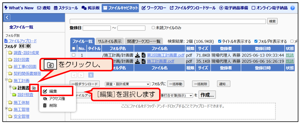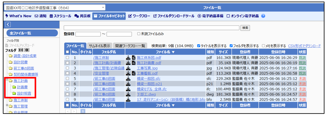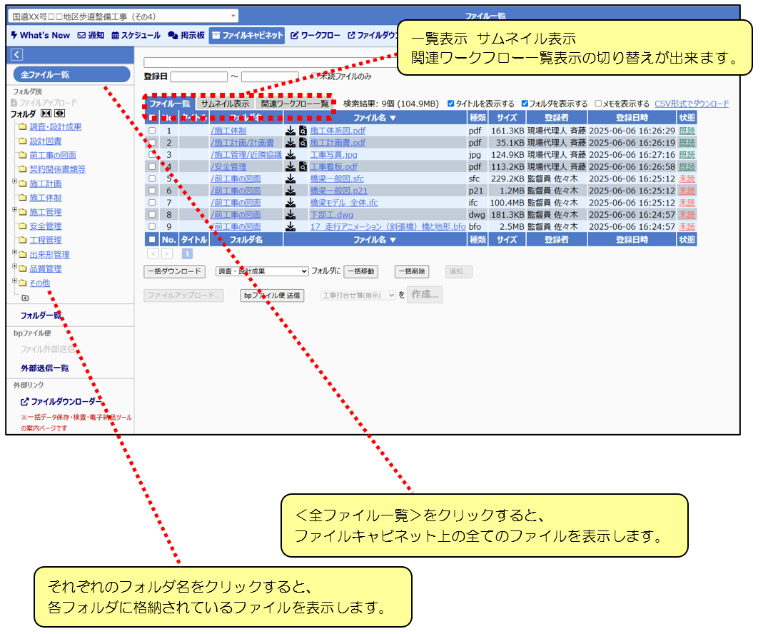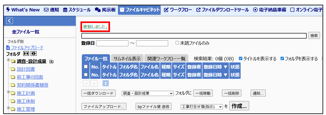 ファイルキャビネット左側メニューの<フォルダ一覧>をクリックします。