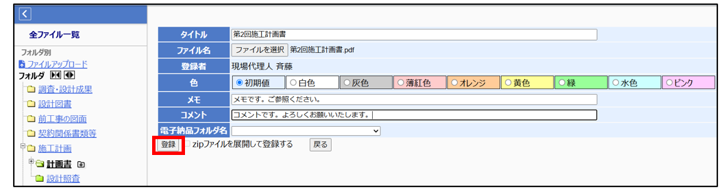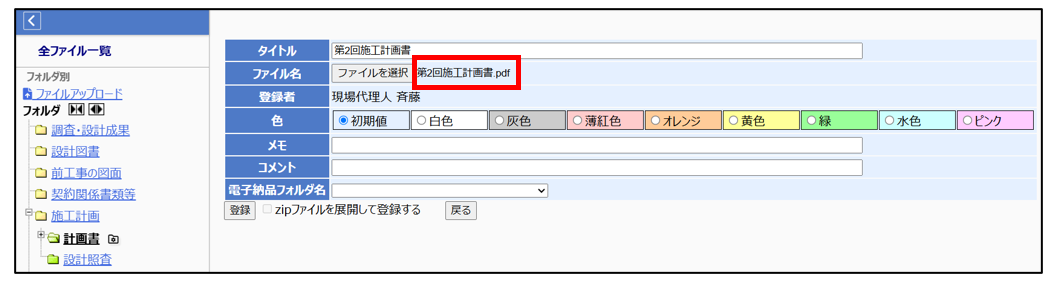 zipファイルのご用意ができましたら、ファイルアップロード画面でzipファイルを選択し、[登録]ボタンの右にある<zipファイルを展開して登録する>にチェックを入れて、[登録]ボタンをクリックします。