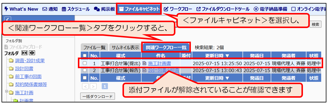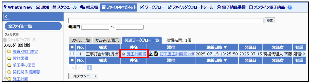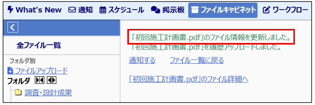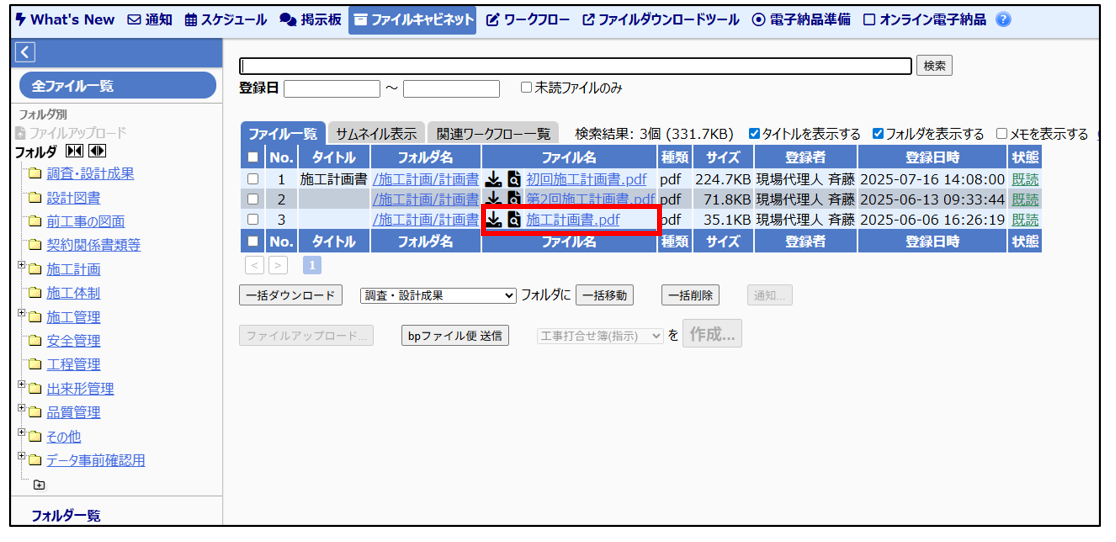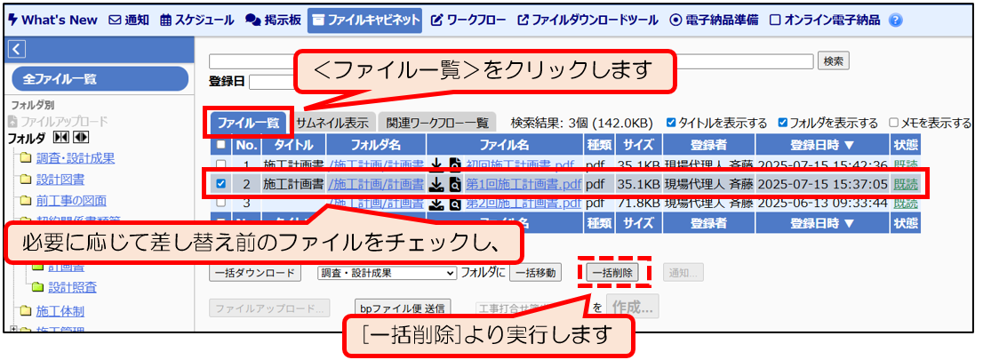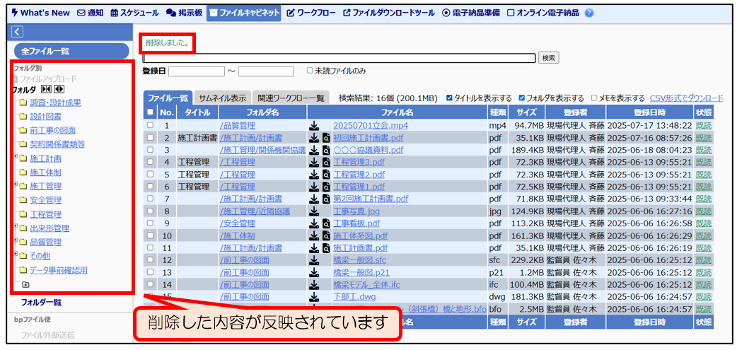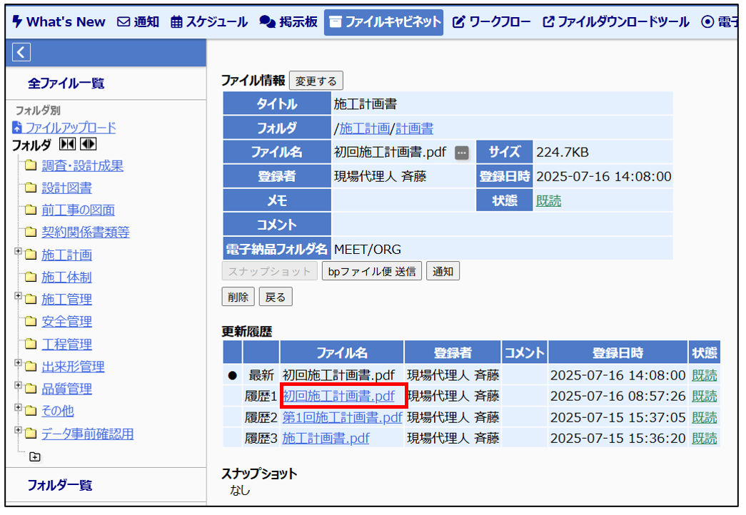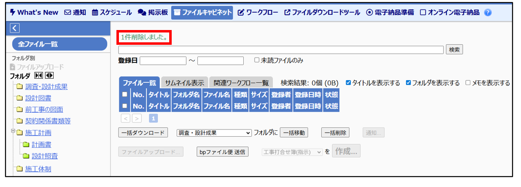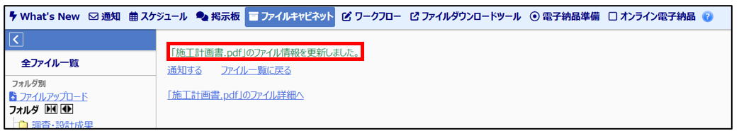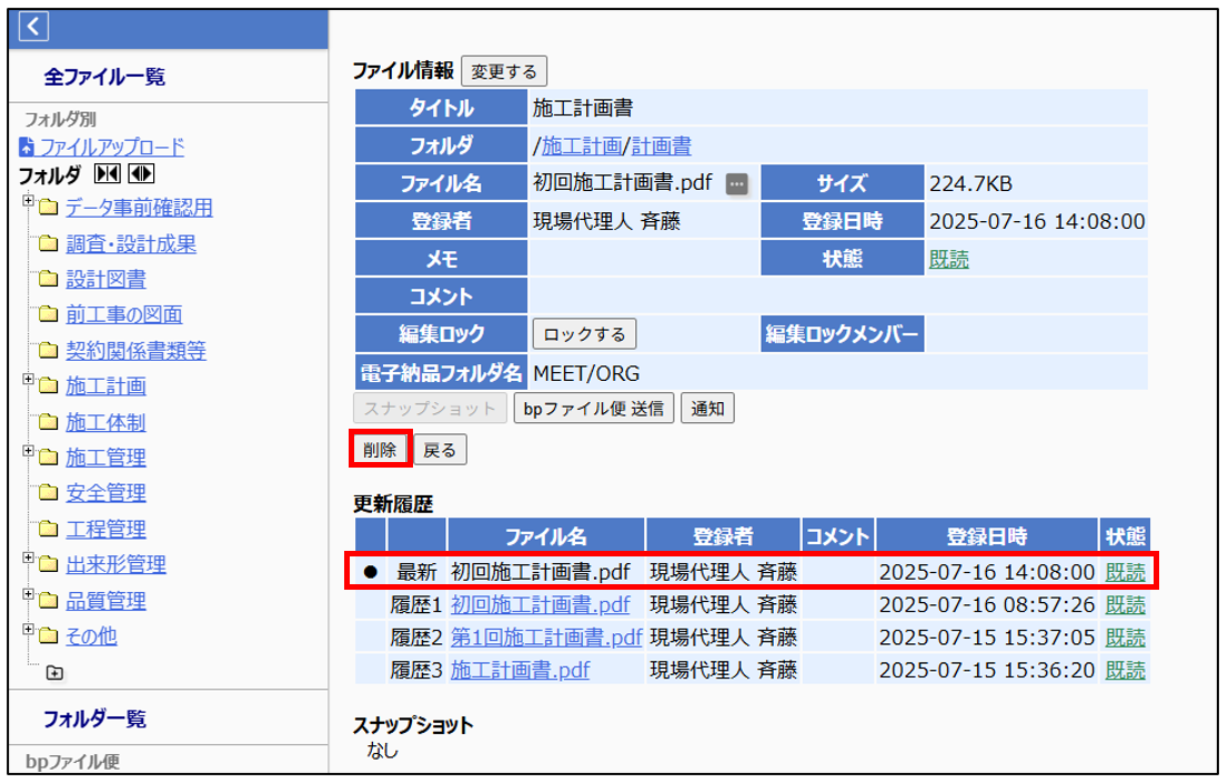 また、最新のファイルを[削除]した場合に該当ファイルに変更前のデータが存在した際は、履歴の管理により、変更前のデータが最新のファイルとしてファイルキャビネット上に表示されます。履歴を含めて削除される場合は履歴分の回数[削除]を実行してください。
