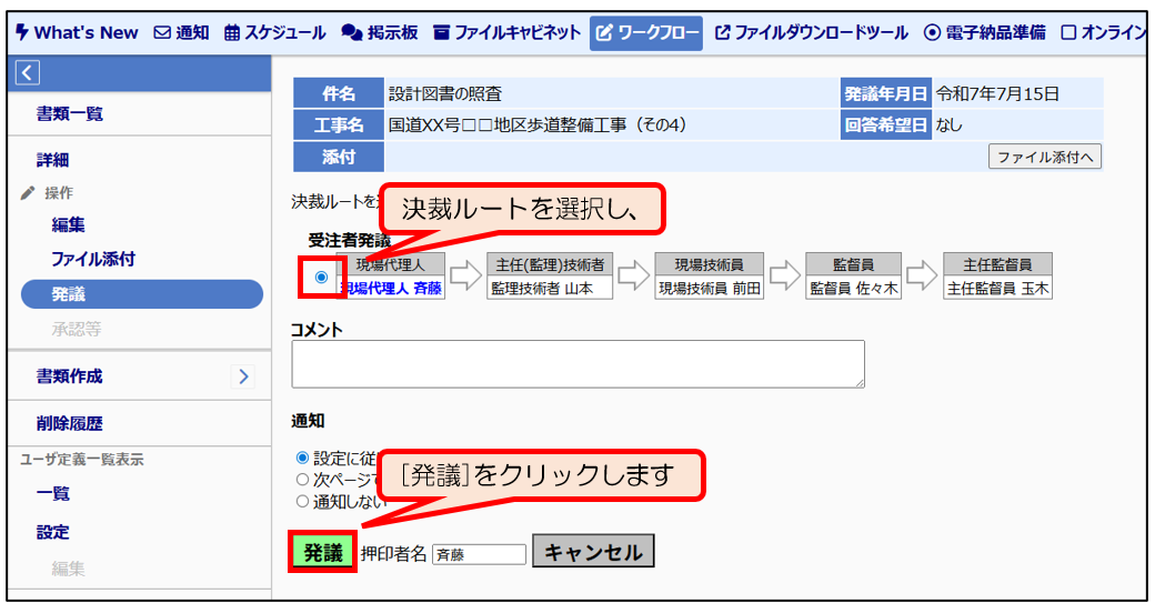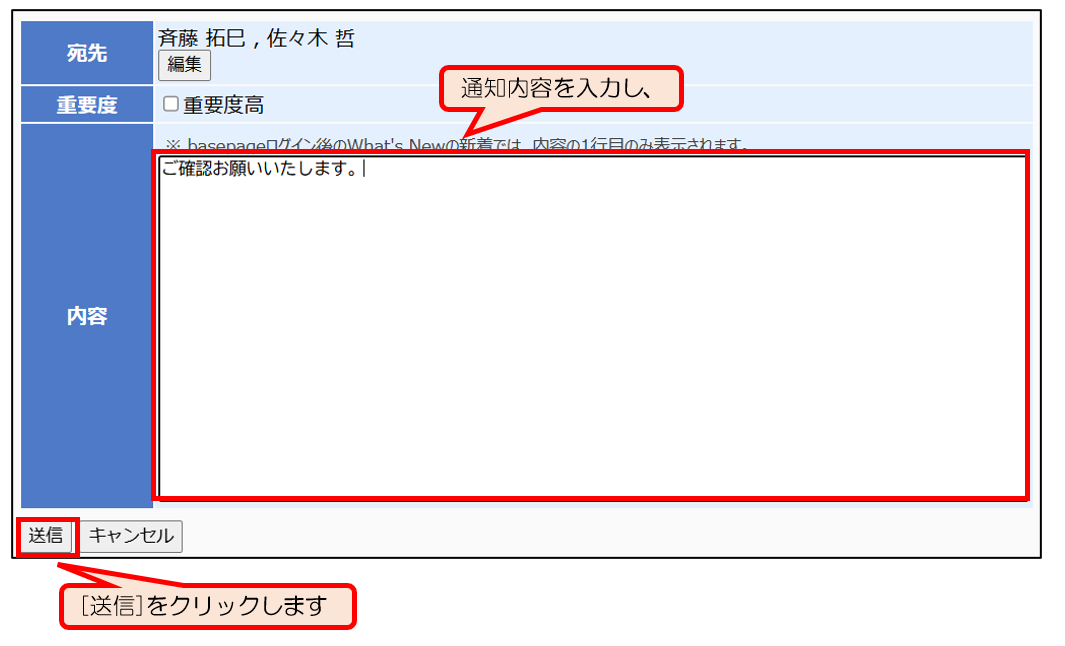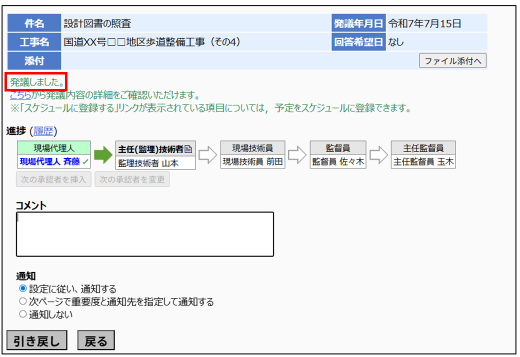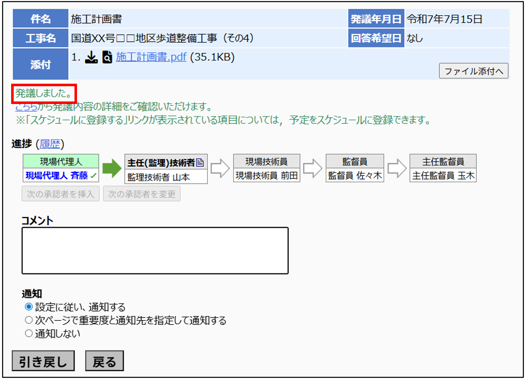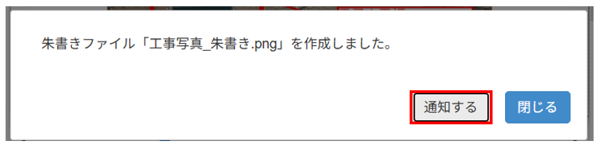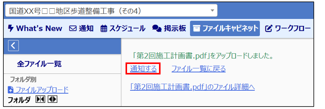 アップロード完了のメッセージが表示される画面で<通知する>をクリックします。