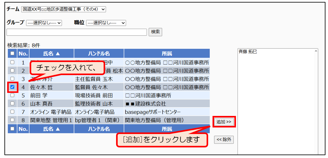 通知の宛先に指定したいメンバーのにチェック入れ、[追加]ボタンをクリックします。