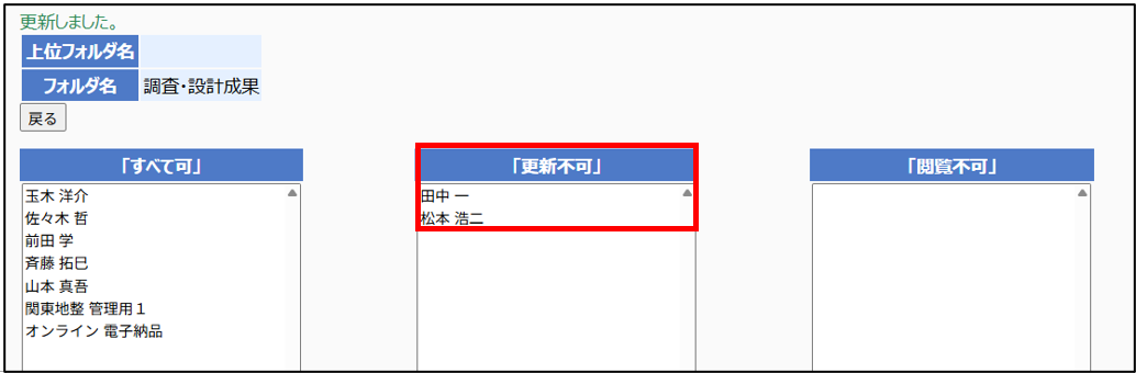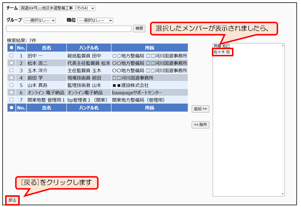 右のリストに選択したメンバーが表示されます。よろしければ[戻る]ボタンをクリックします。