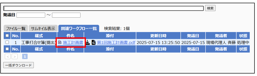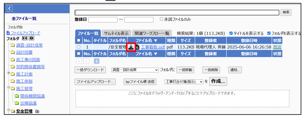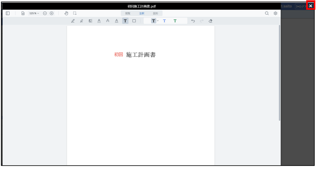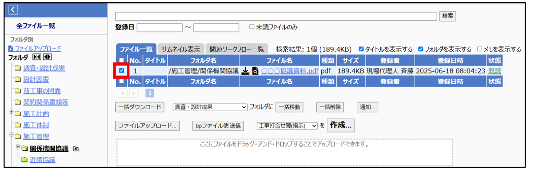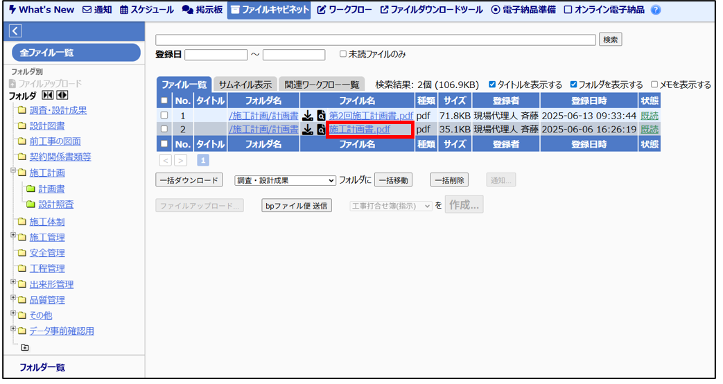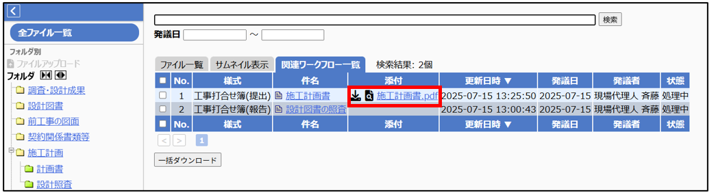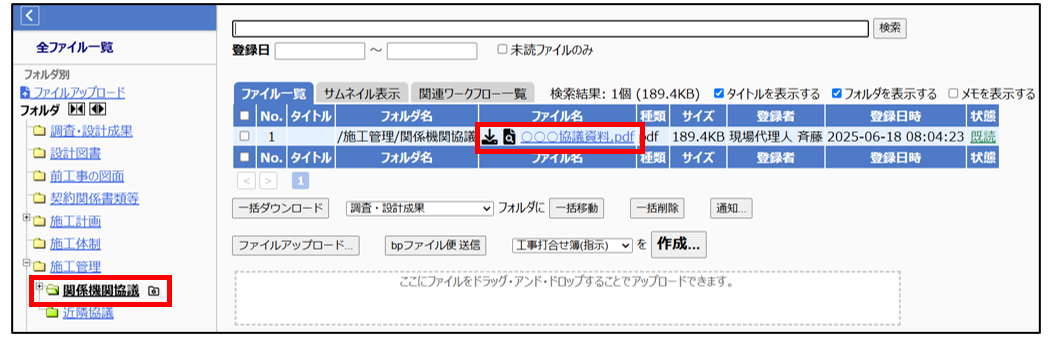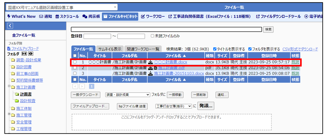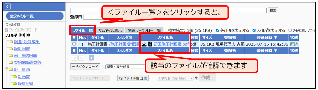 ファイルキャビネットにて詳細画面のビューアを展開する場合、画面上から閲覧したいファイル名をクリックします。