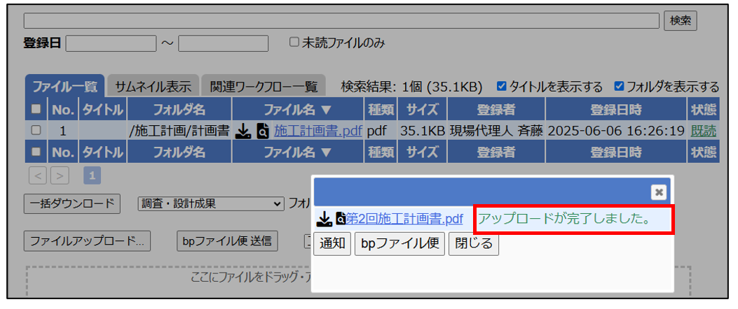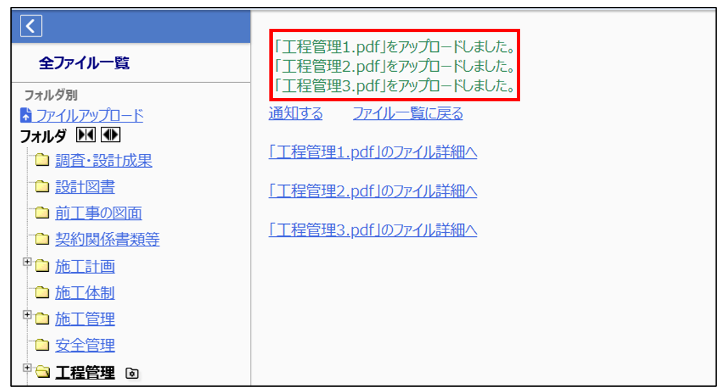 『「各ファイル」をアップロードしました。』表示されましたらアップロード完了です。