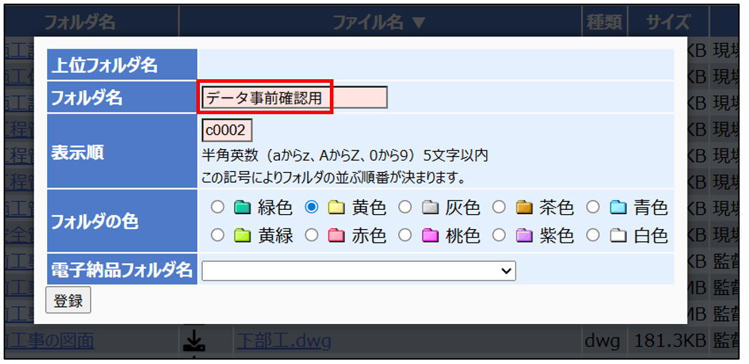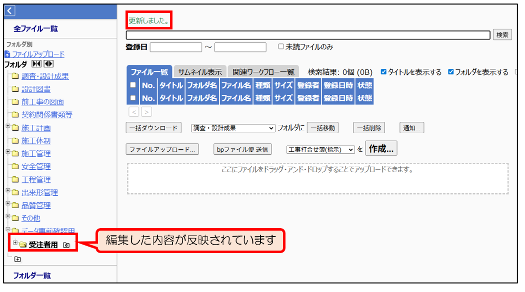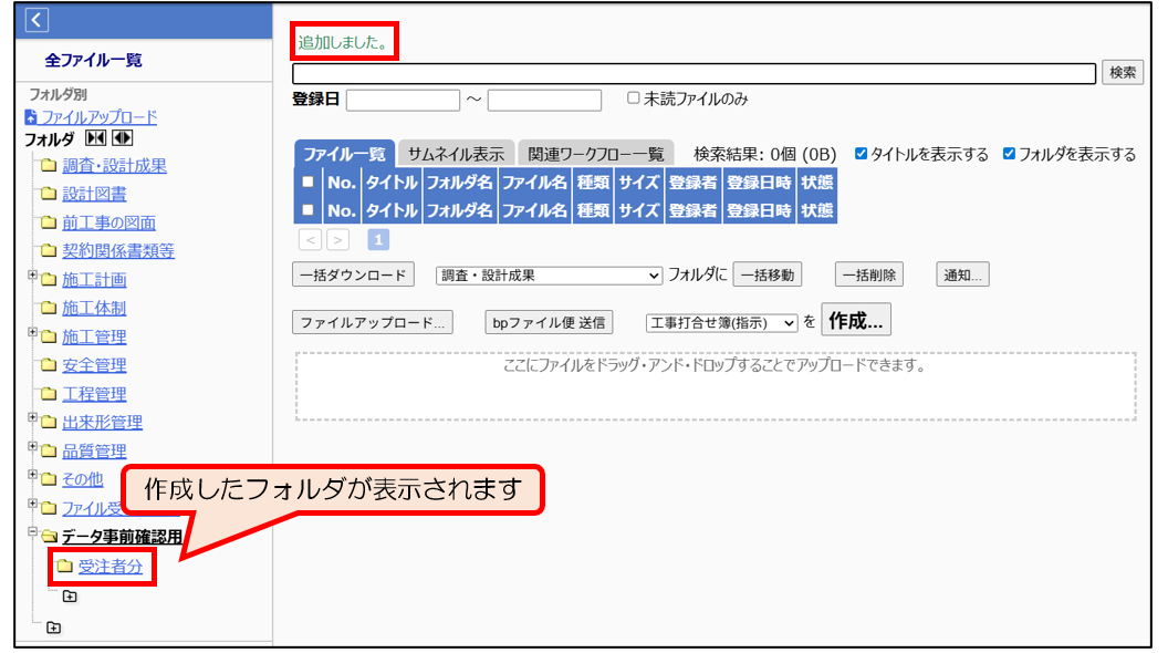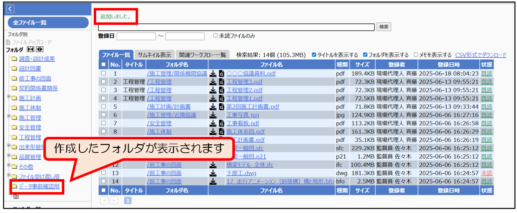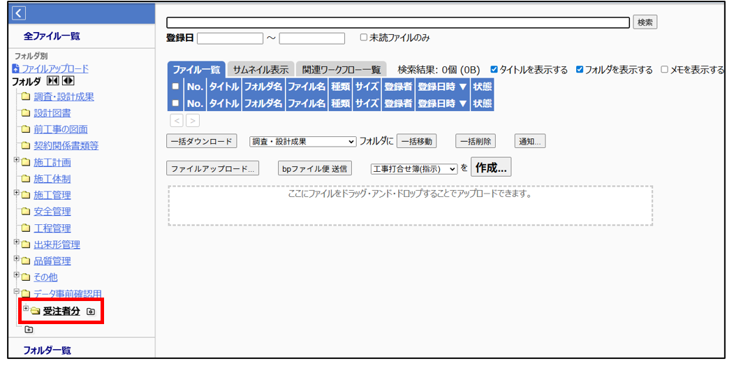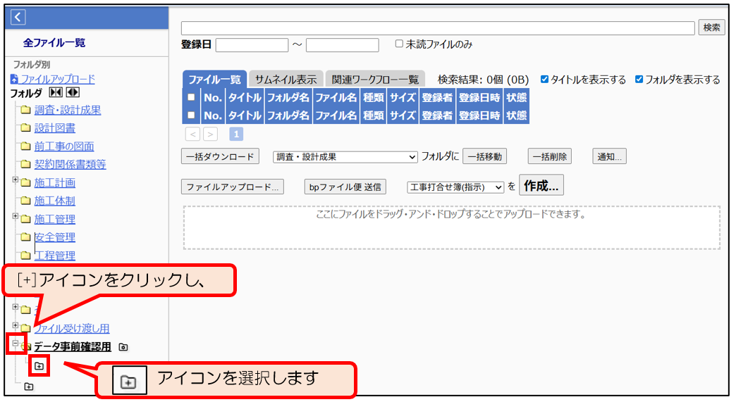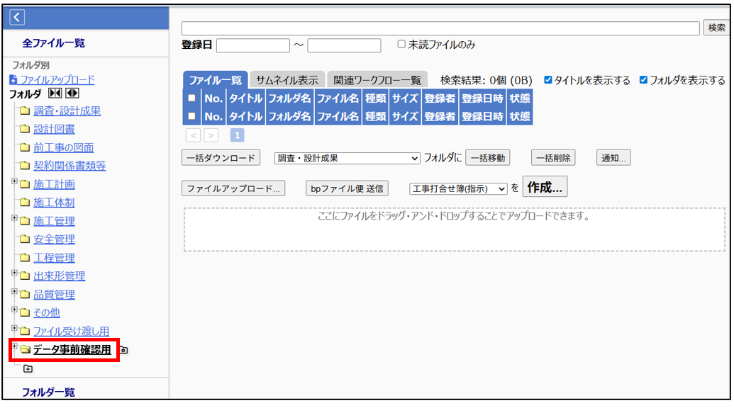 例として<データ事前確認用>フォルダを<調査・設計成果>フォルダの上に移動する手順をご説明します。