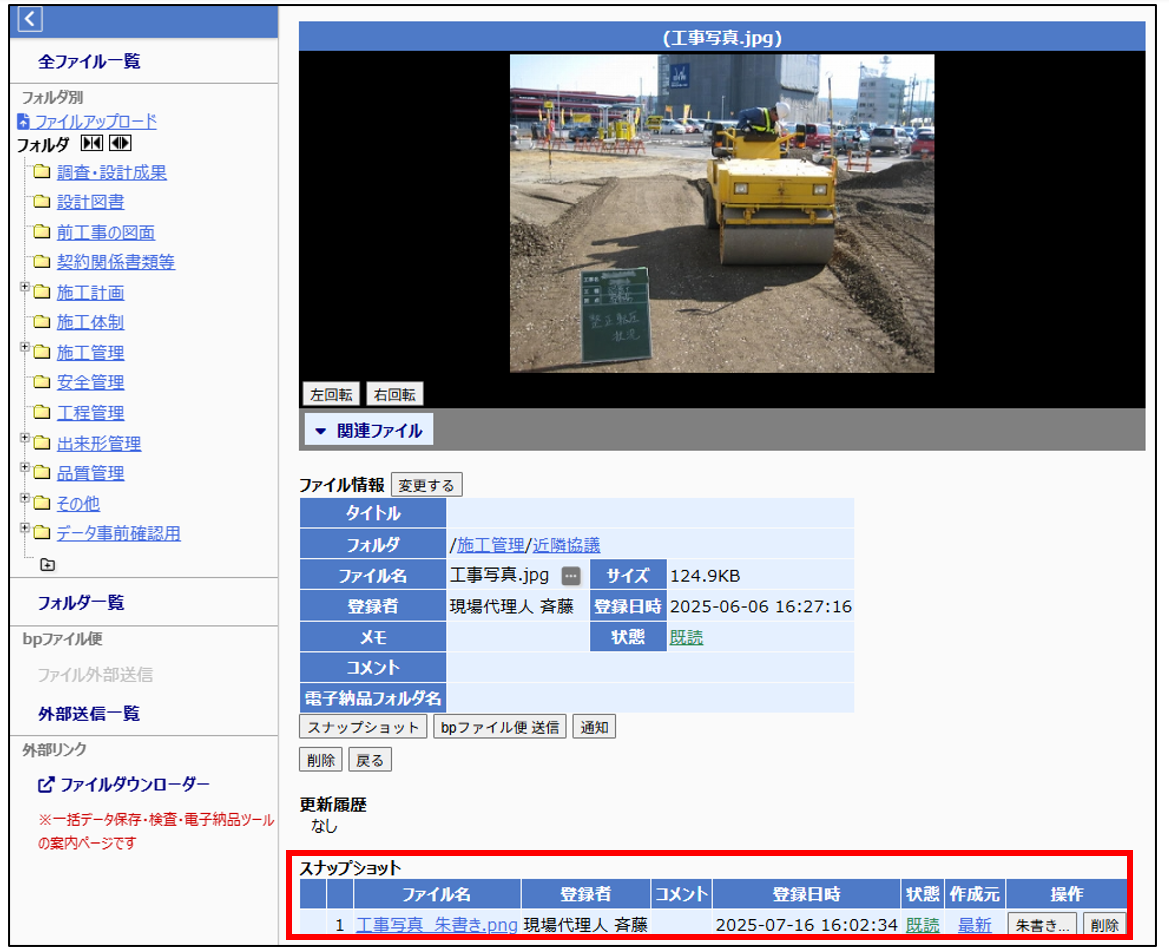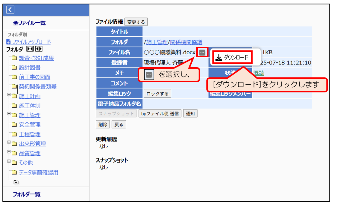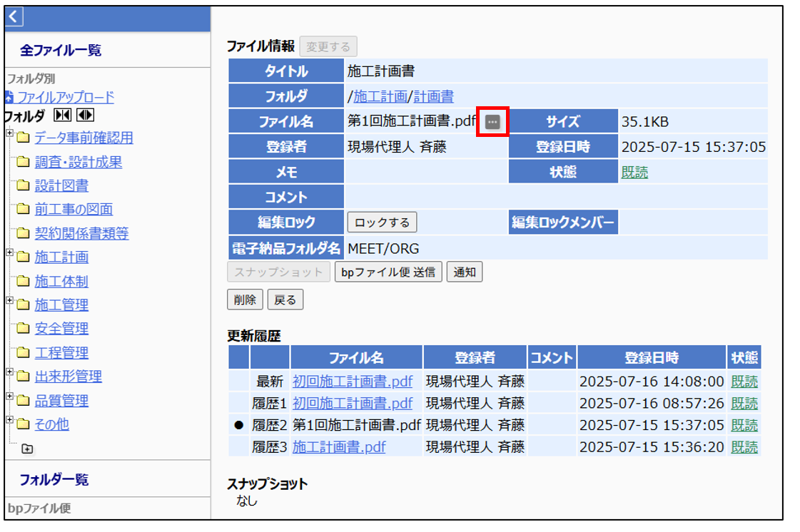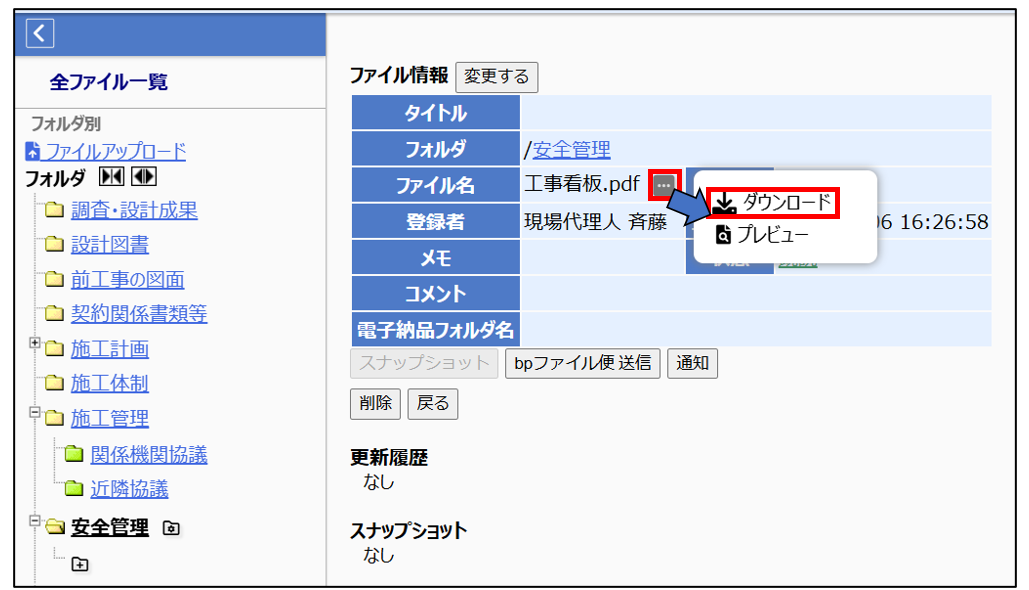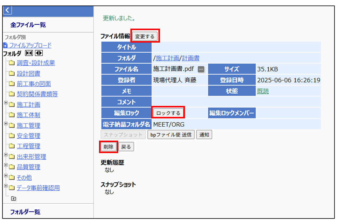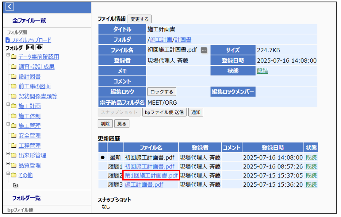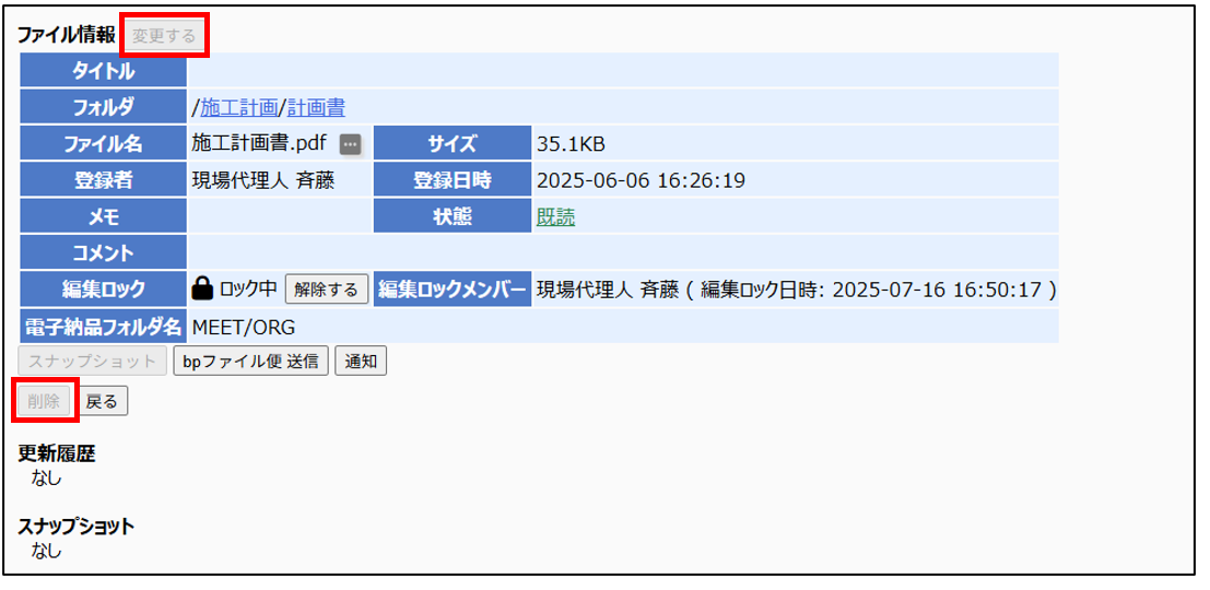 ファイル詳細画面下部の「更新履歴」にファイルの変更前のデータの登録履歴が表示されます。