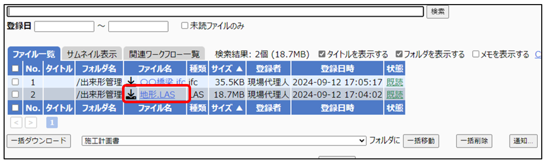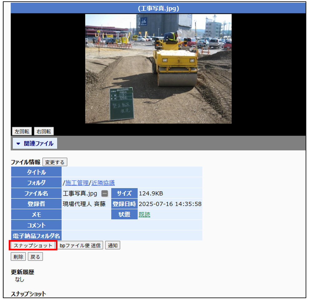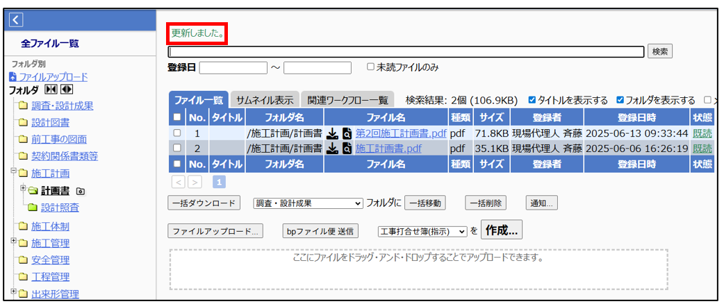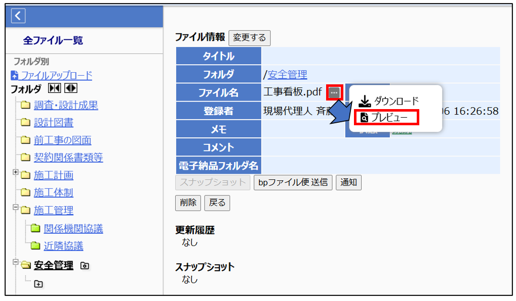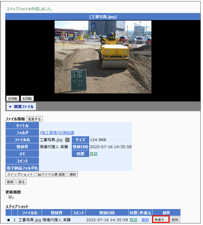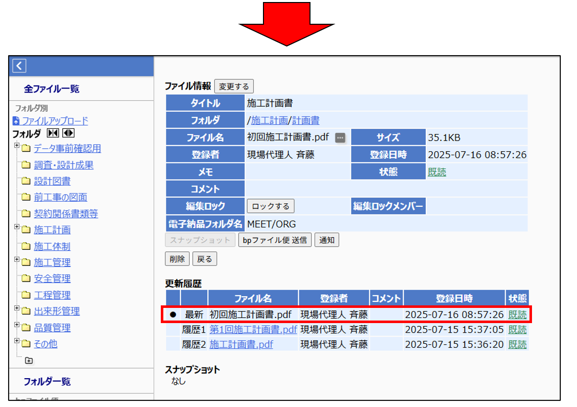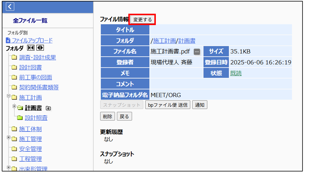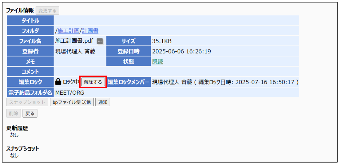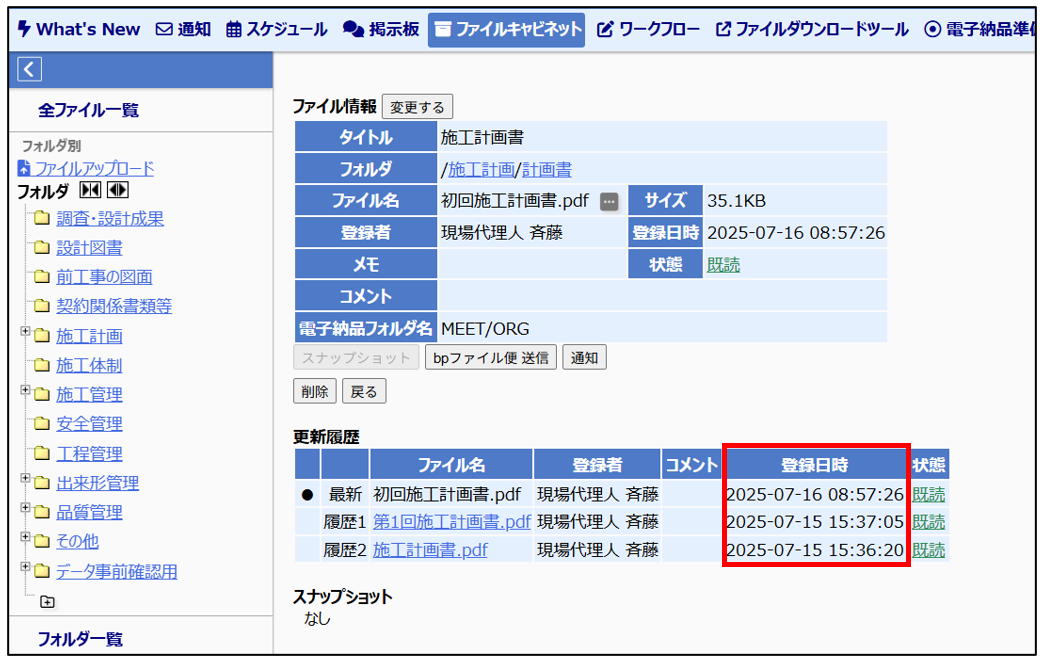 ファイル詳細画面下部の「更新履歴」にファイルの変更前のデータの登録履歴が表示されます。
