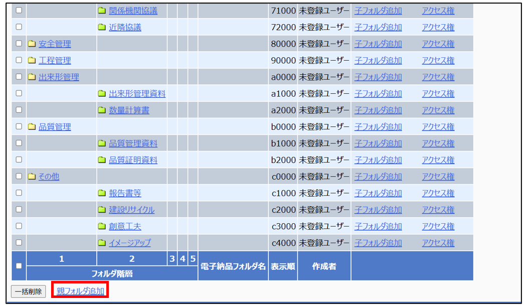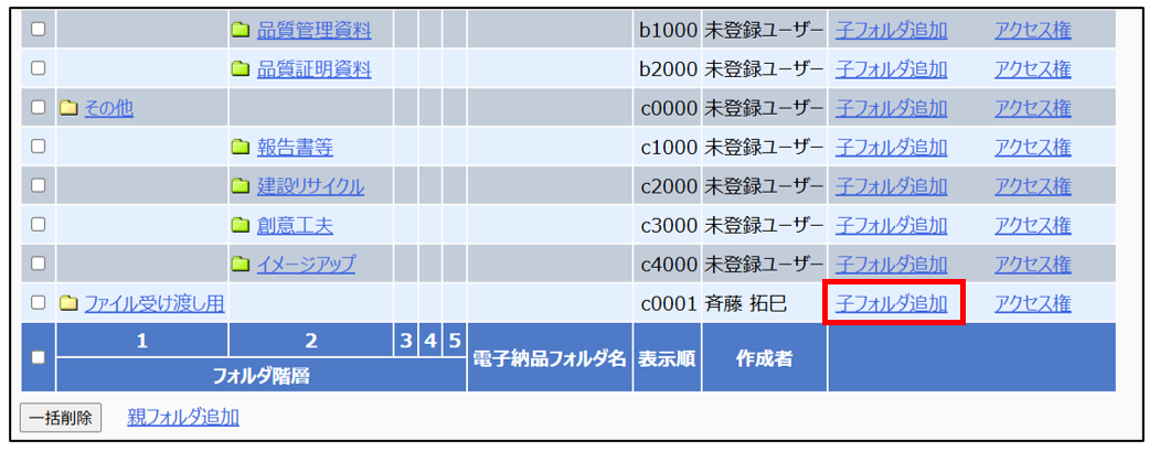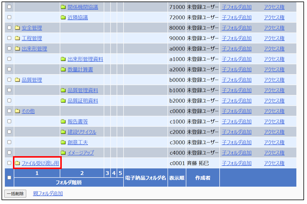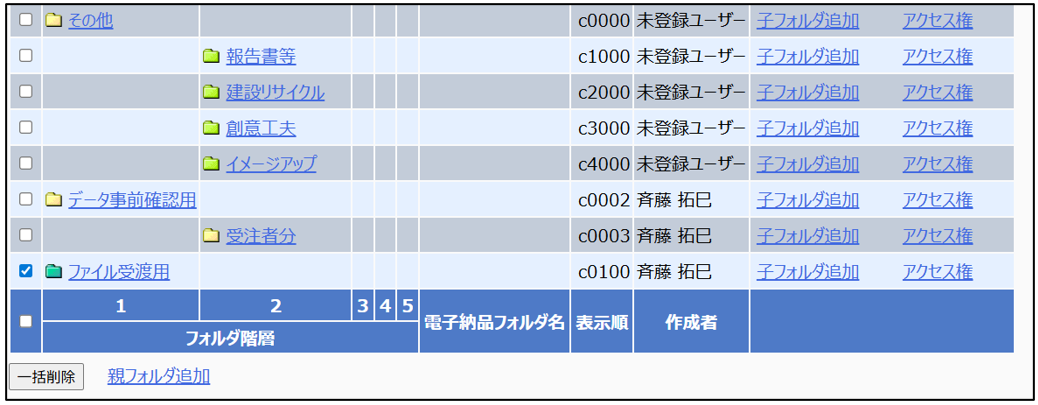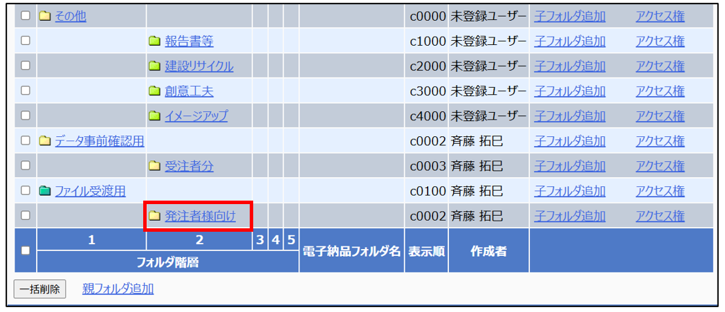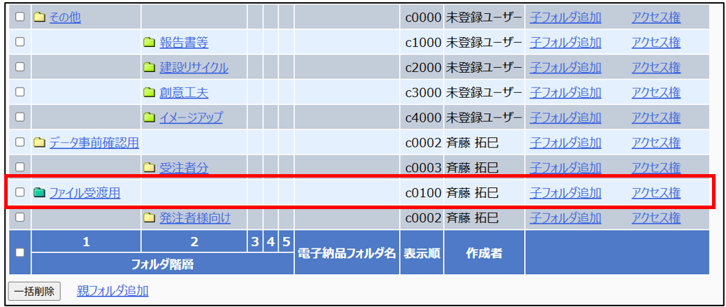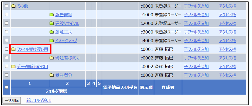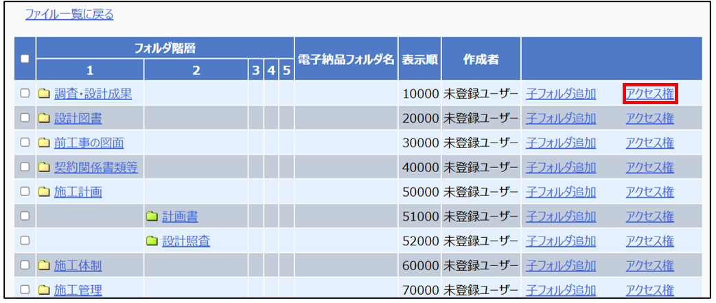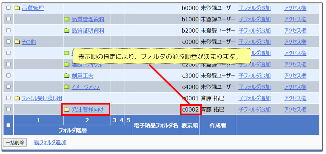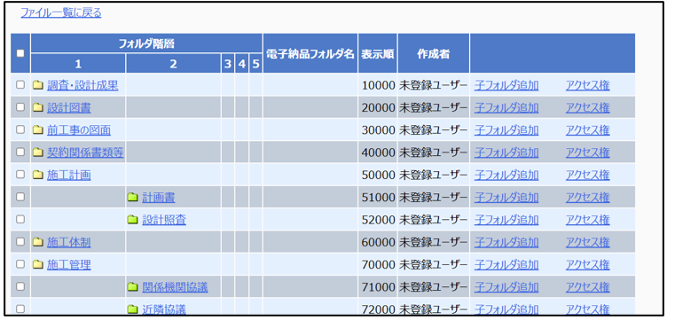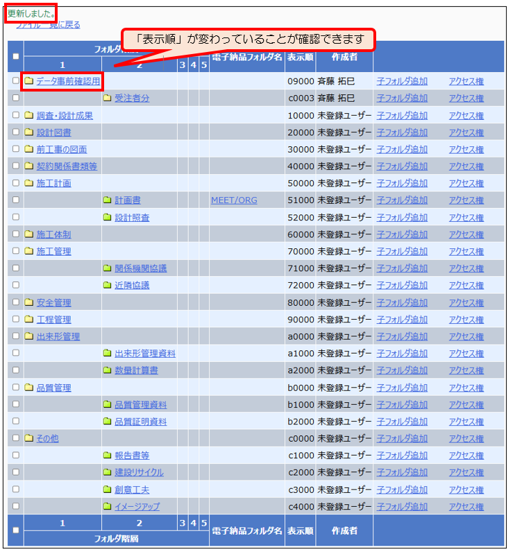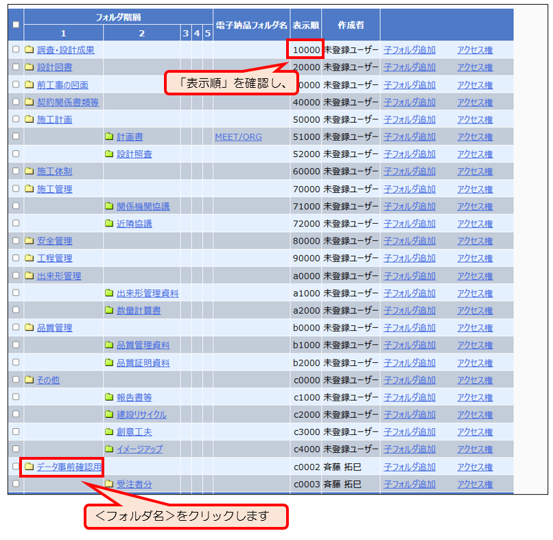 フォルダ階層が一覧表形式で表示されますので、並べ替えたい位置の前後のフォルダの「表示順」を確認し、並べ替えたい<フォルダ名>をクリックします。