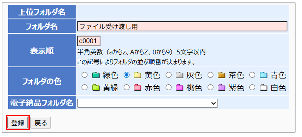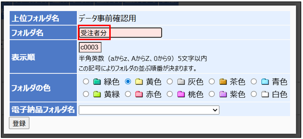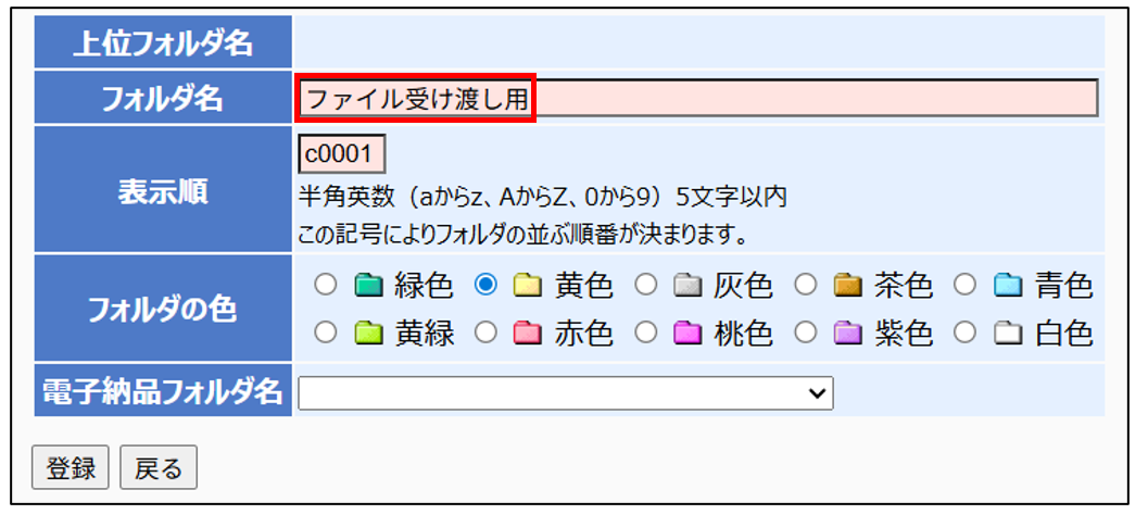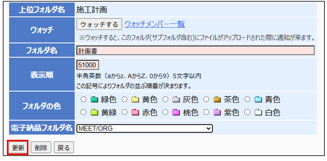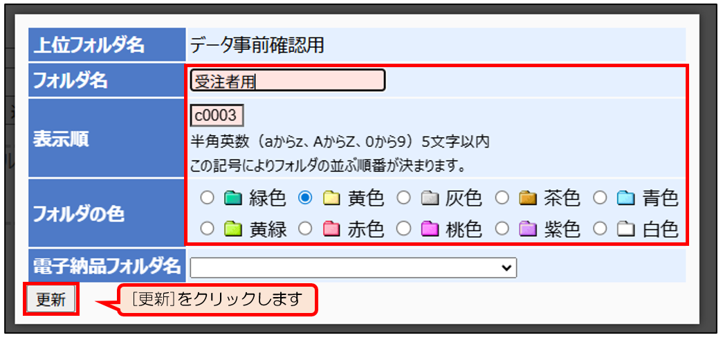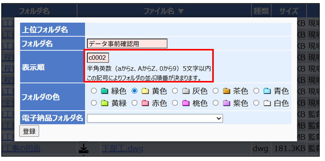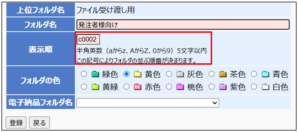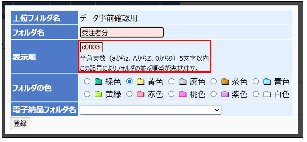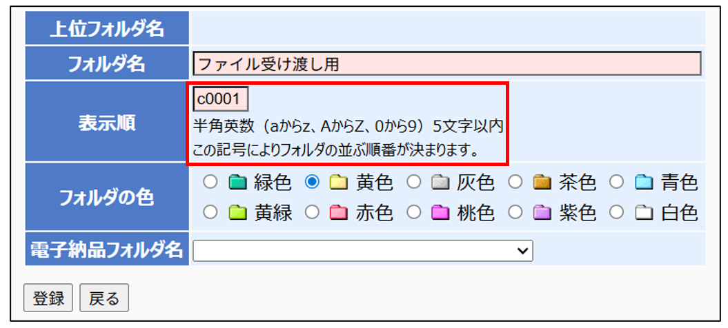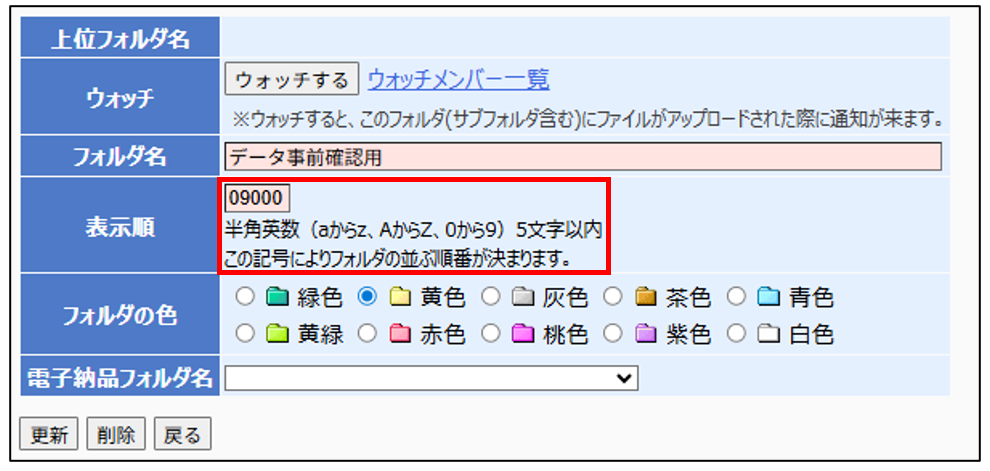 フォルダの詳細画面が開きますので、「表示順」の数字を移動させたい場所の前後のフォルダ表示順の間へ設定します。