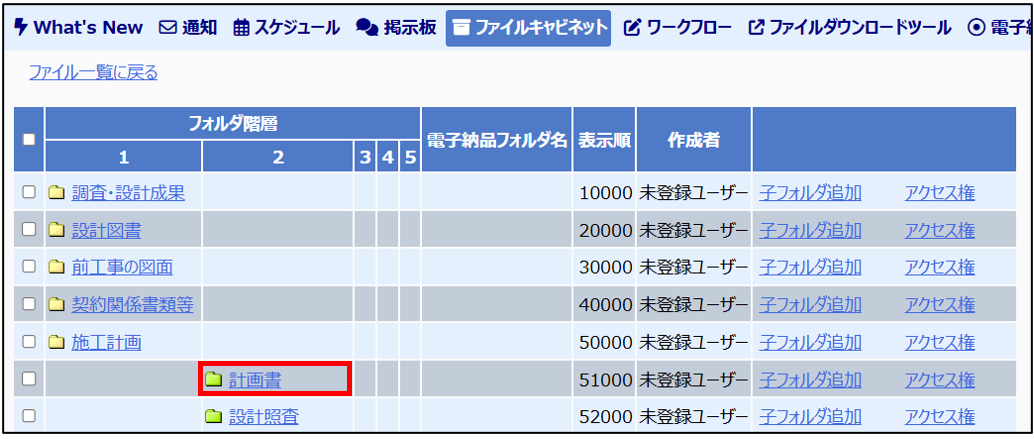 ファイルキャビネット左側メニューより<フォルダ一覧>をクリックします。