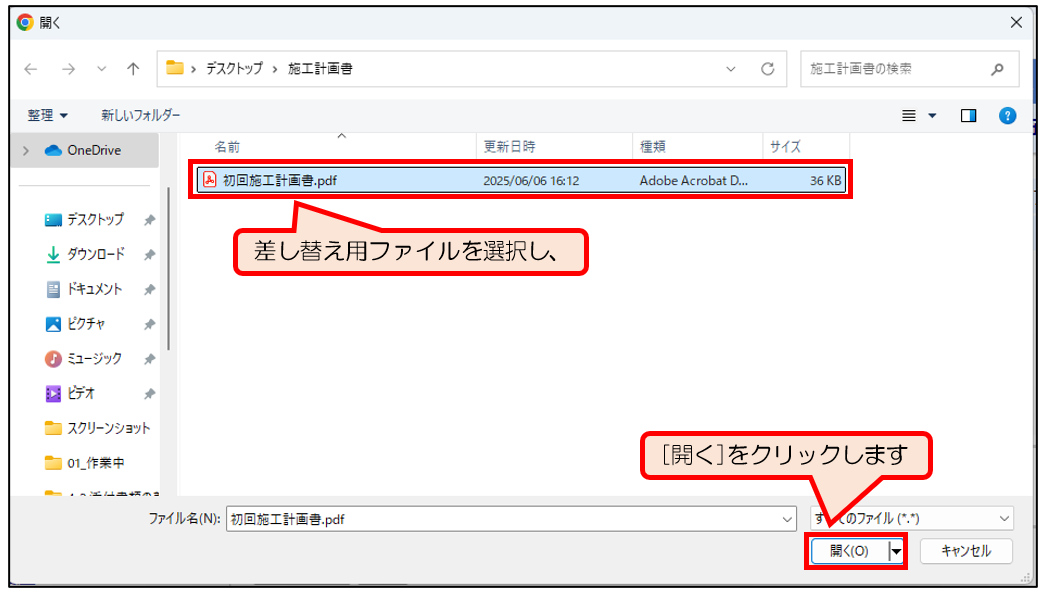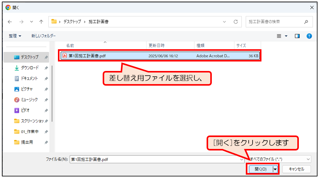 アップロードしたいファイルを選択し、[開く]ボタンをクリックします。