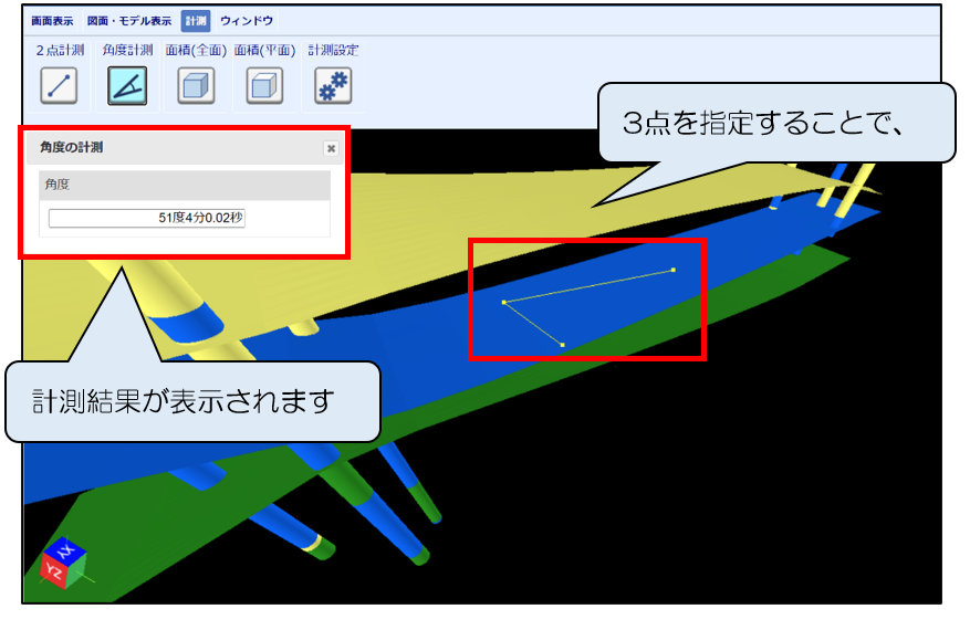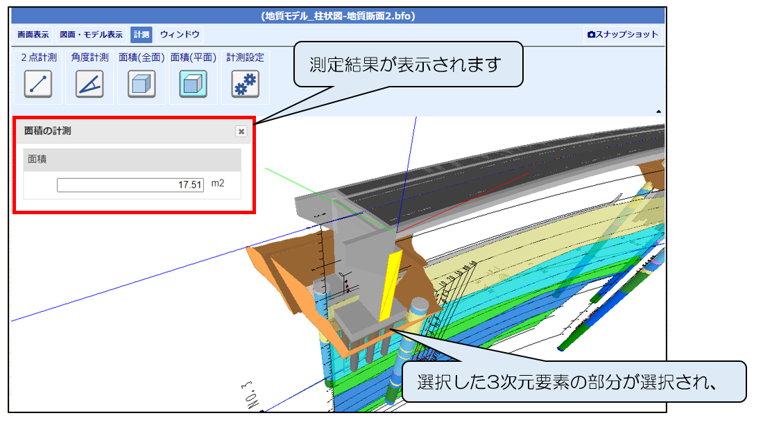 選択した3次元要素の部分(ポリゴン単位)が選択(着色)され、面積の計測結果が表示されます。続けて別の要素を選択すると、面積が加算されていきます。