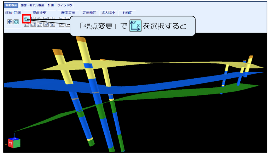 ・左上のメニューを選択し、中央やや下部にある「Navigation」の中央の段の中から表示させたい方向のアイコンを選択すると、その方向からの表示に変更できます。