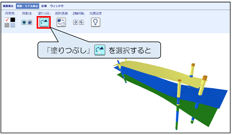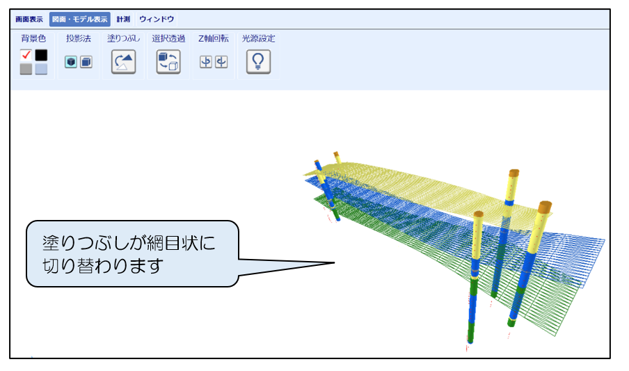 「塗りつぶし」コマンドでサーフェスの塗りつぶしを全体/網目状で切り替えられます。